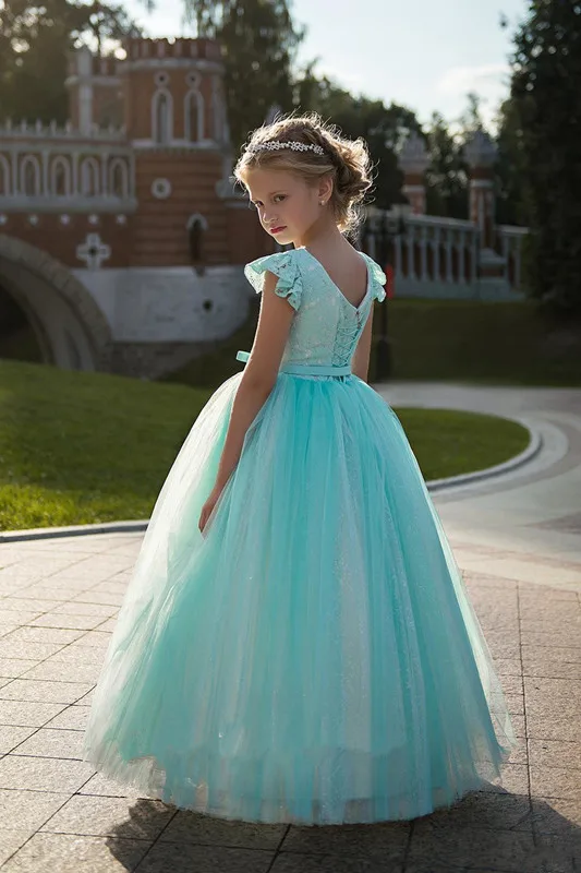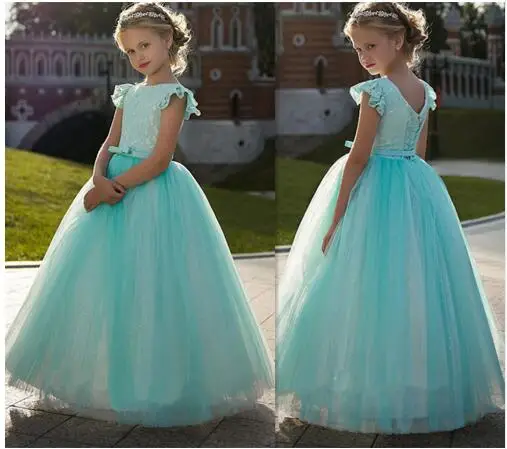 Винтажное платье для девочек небесно-голубого цвета с кружевом и цветами, вечерние платья принцессы на шнуровке сзади, милые вечерние платья для девочек