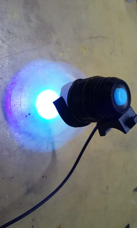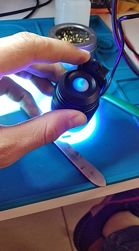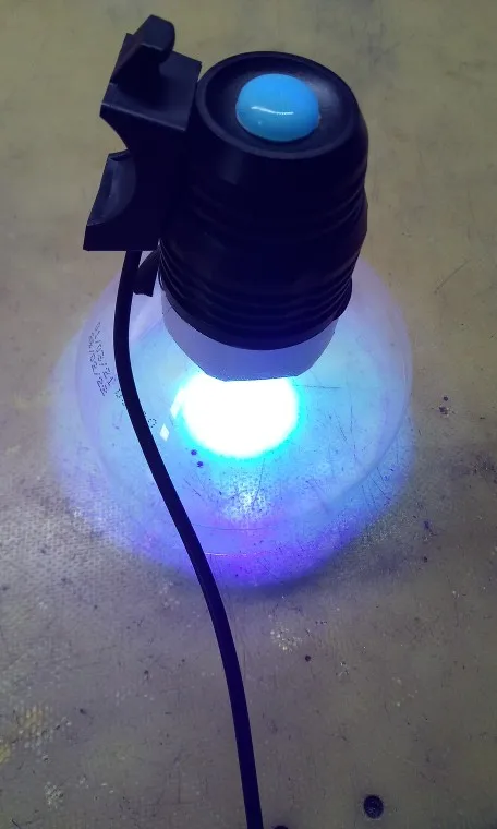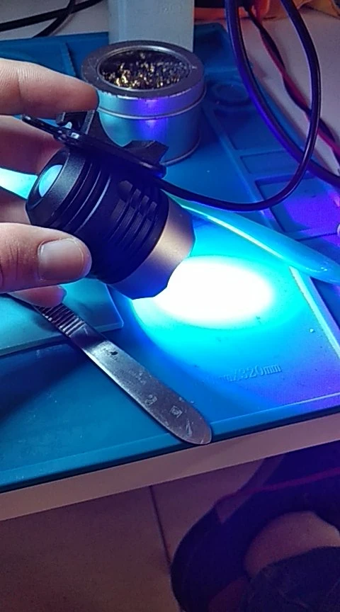 Опробовал -класс! маска застывает примерно за 2 - 4 минуты! Годная штука! Питание от USB, можно питать от повербанка или от usb порта компьютера. Пробовал и так и так, работает хорошо. Теперь остаётся тест на надёжность -насколько хватит этого светила. Вырезал из пластиковой бутылки раструб, чтобы не держать фонарь над платой рукой.
