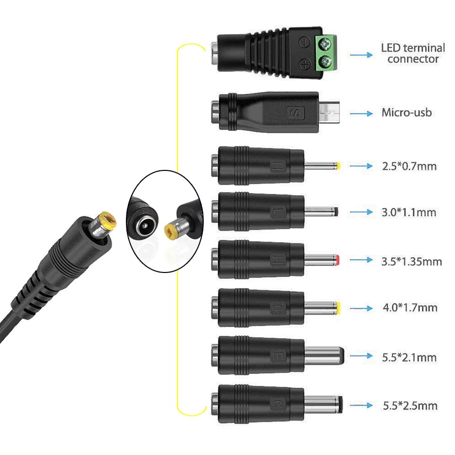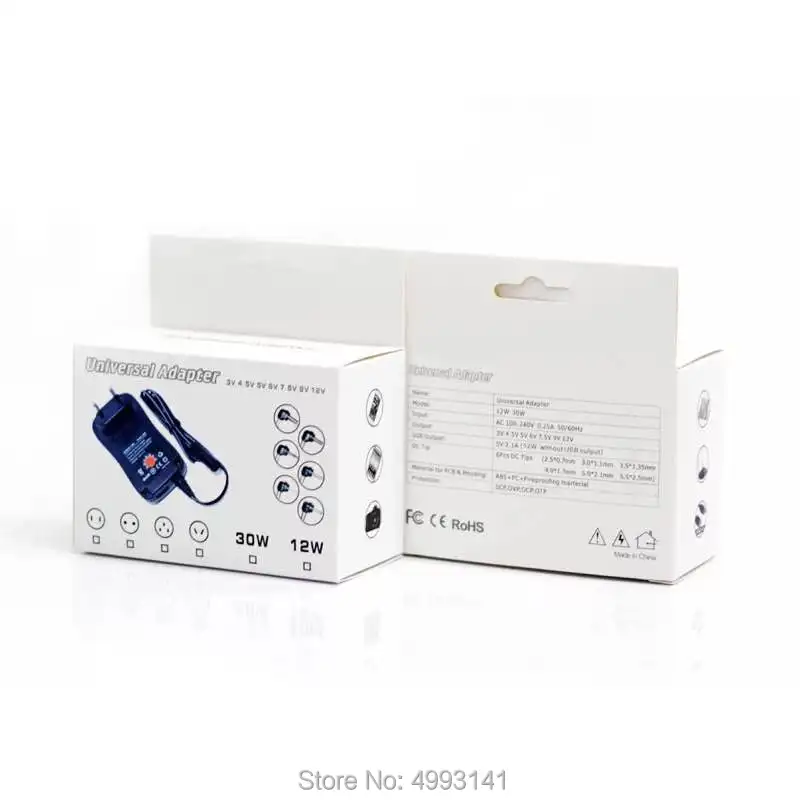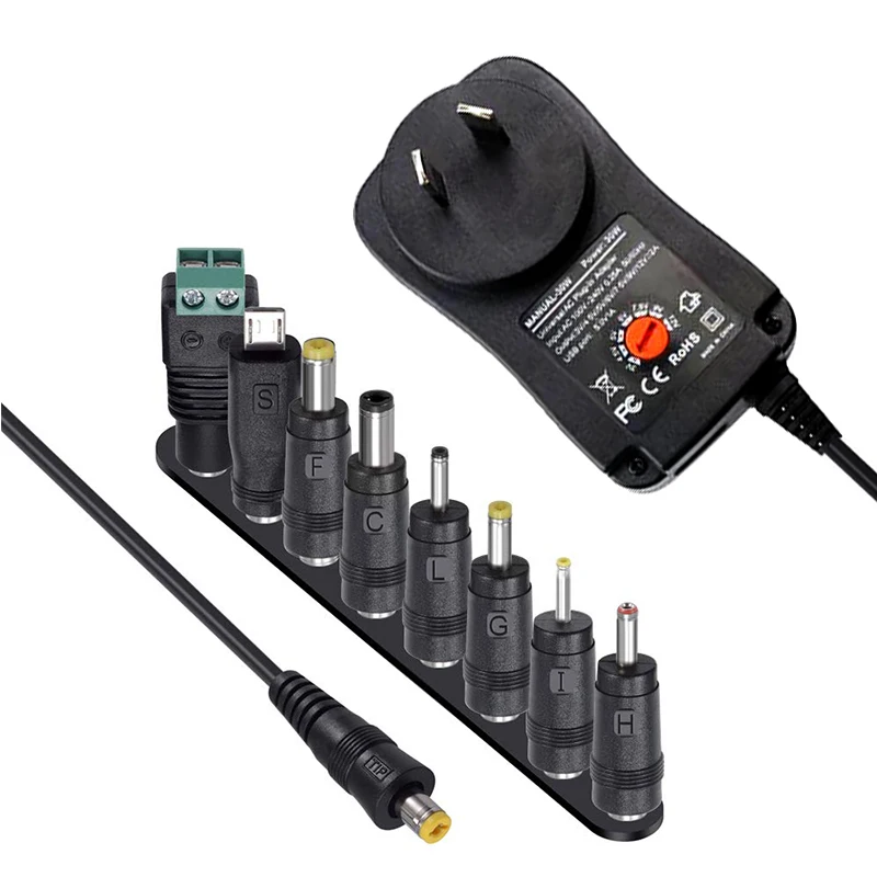 100% абсолютно новый 100V-240V преобразователь переменного тока в постоянный, Мощность адаптер питания Вход: 100-240VAC 0.3A 50/60Hz Мощность: 30 Вт Выход напряжение: 3V 4,5 V 5V 6V 7,5 V 9V 12V (поскольку мерки снимаются вручную, регулировка) Выходной ток: 2.5A Макс, совместим с 500mA, 1A, 1.5A Выход USB: 5 В = 2,1 А Макс. Штекером постоянного тока для подключения к Размеры (внешний Диаметр и внутренняя Диаметр): 2,5*0,7 мм, 3,0*1,1 мм, 3,5*1,35 мм, 4,0*1,7 мм, 5,0*2,1 мм, 5,5*2,5 мм, светодиодный разъем, Micro USB Тип контактного разъема постоянного тока: полярность не может меняться, центр является положительным полюсом (+), а внешняя сторона отрицательная (-), размер двух штырьков с соединением отличается. Спецификация штепсельной вилки: штепсельная вилка AU Длина кабеля: 115 см Цвет: черный Использование: для мобильного телефона, ТВ-бокса, CC TV, камеры, аудио плеера, телефона, CD, VCD, ретранслятора, рации, компьютера, электронного органа, игрового автомата, небольшого телевизора, медицинское оборудование, компьютерное и электронное оборудование и т. Д.