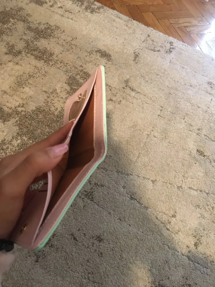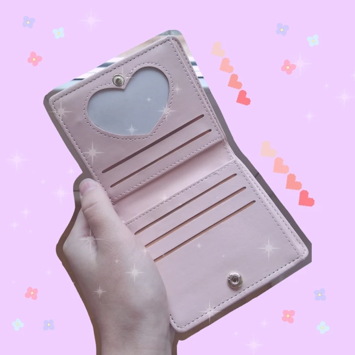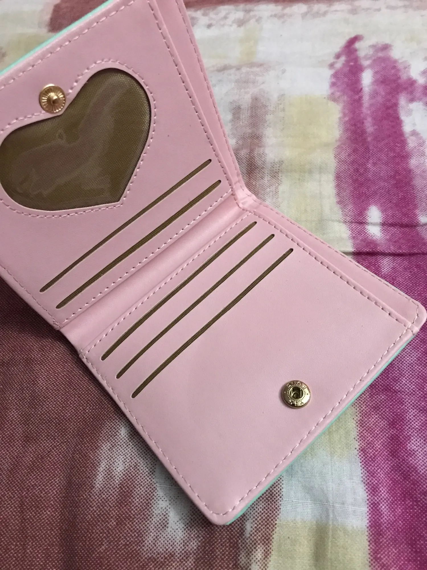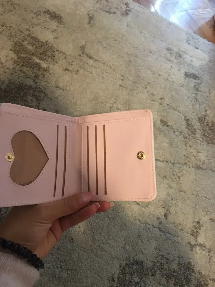 Хороший кошелек. Аккуратный и небольшой. Пару коротких ниточек торчало, но это не беда. Меня больше расстроило то, что нет отсека для монет. это, наверное, самый большой минус. но жить можно) Порадовало то, что где фотография, 'рамочка' в виде сердечка