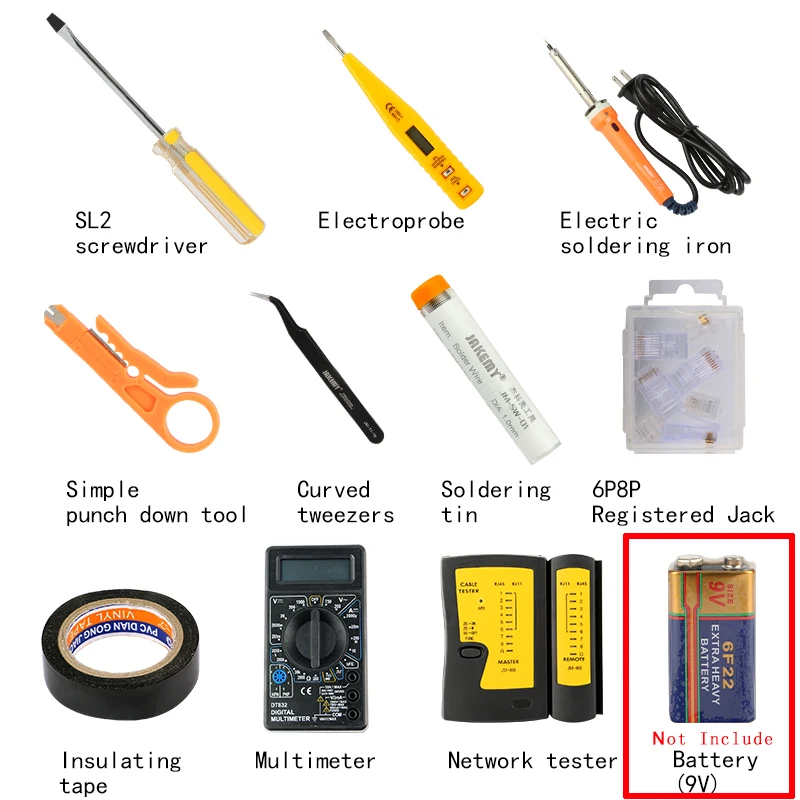Приятный комплект. Удивлен изоленте и батарейке типа крона в комплекте - обычно они не присутствуют в доставке (хотя тут доставка по РФ, может это только с Китая на таможне так). Мультиметр на диодной прозвонке имеет секундный "затуп", грустно но не критично. Паяльник под плоский штекер розетки - для него придется дооборудовать комплект переходником под евро.