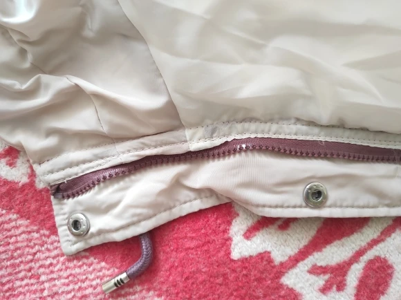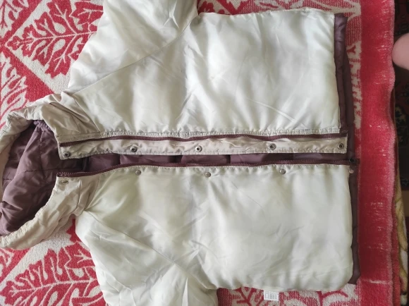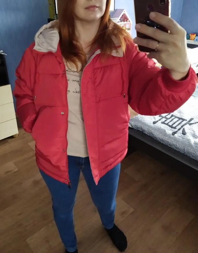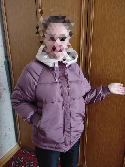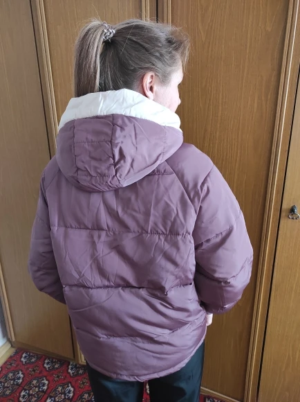 На фото продавца куртка выглядит матовой, фактически материал блестит. Внешний материал выглядит как материал для подклада, внутренний - самая дешёвая подкладочная ткань. По размеру мне подошёл - брала на российский 44-46. Молния пластиковая, на вид хлипкая. Синтепон распределён неравномерно. Молния вшита криво (видно с внутренней стороны изделия). Подклад просвечивает, видно, что швы внутри не обработаны, прошиты на один раз и по краям материал разлазится. Также было много торчащих ниток по карманам и по молнии. Не знаю, как можно соотнести цену и качество, если бы пошив был лучше, возможно, не жаль было бы и доплатить. Покупала за 1600 с небольшим. Больше всего смущают кривые швы и неравномерный синтепон. Внутренних карманов нет, петельки для вещания тоже нет. Наружные карманы без молнии, но достаточно глубокие и удобные. Вывод такой - идея куртки хорошая, но исполнение подвело.