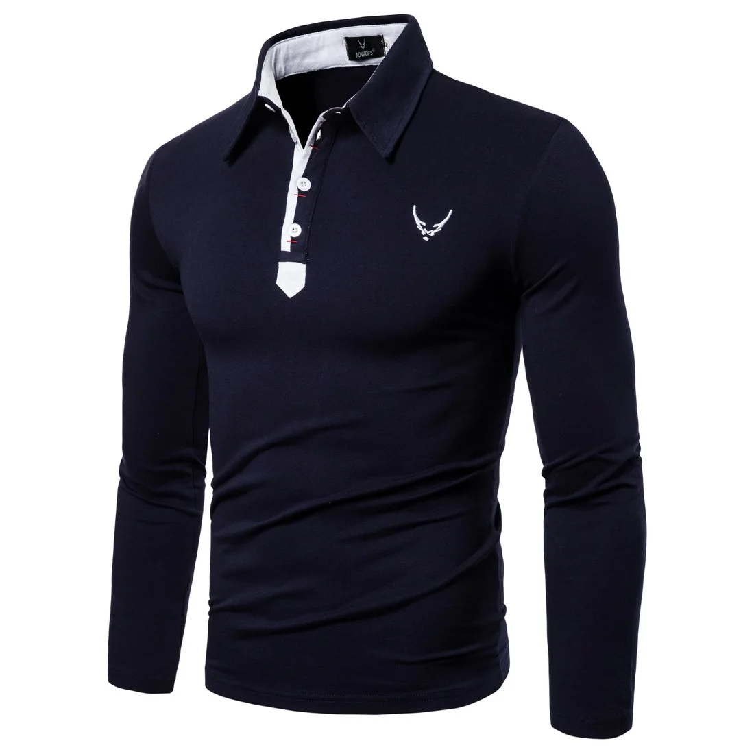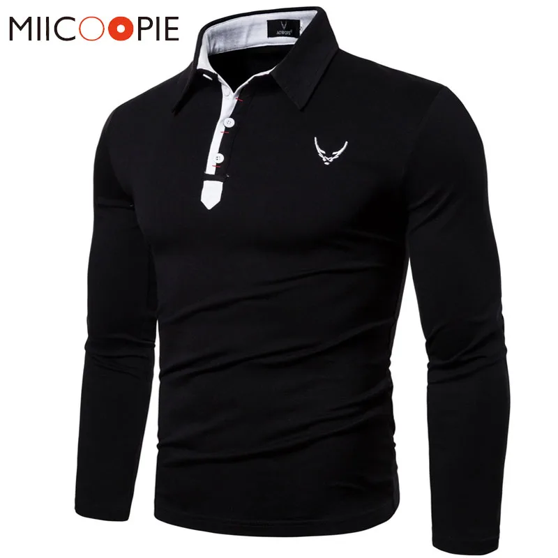 Рубашка поло мужская с длинным рукавом, повседневная классическая Деловая одежда с вышивкой, Мужская Однотонная футболка-поло высокого качества, 2019