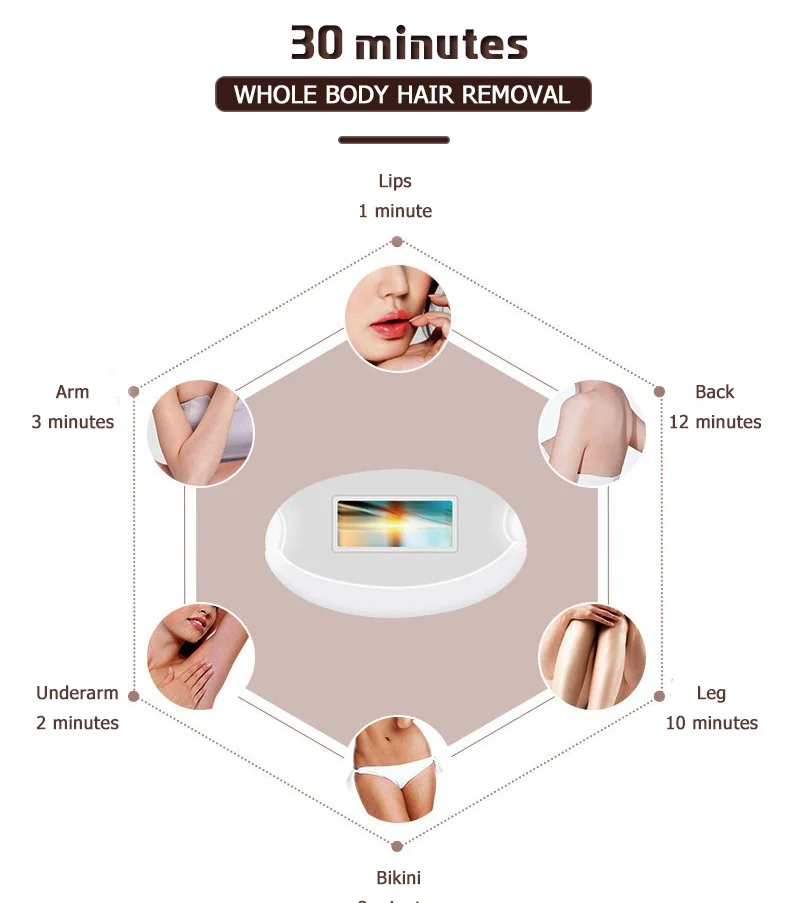 6. Быстрая и большая площадь обработки: 4,2 квадратных см размер пятна не слишком большой или не слишком маленький для любого изгиба тела, высокая эффективность и быстрая скорость, которая занимает всего несколько минут, чтобы удалить перекрывающиеся волосы, которые трудно для традиционного метода удаления волос