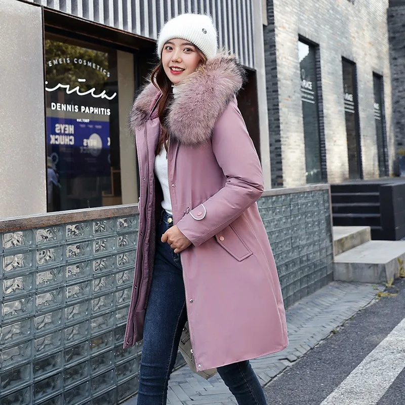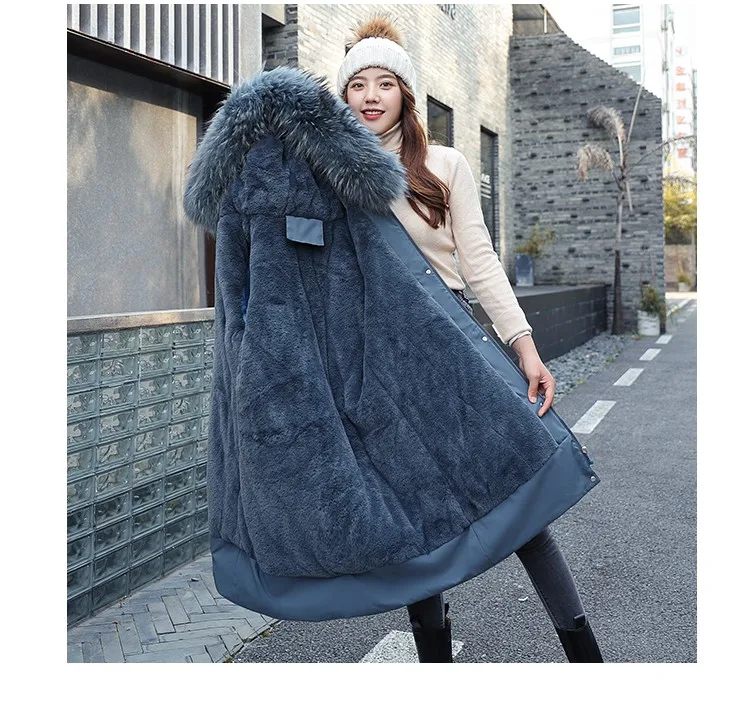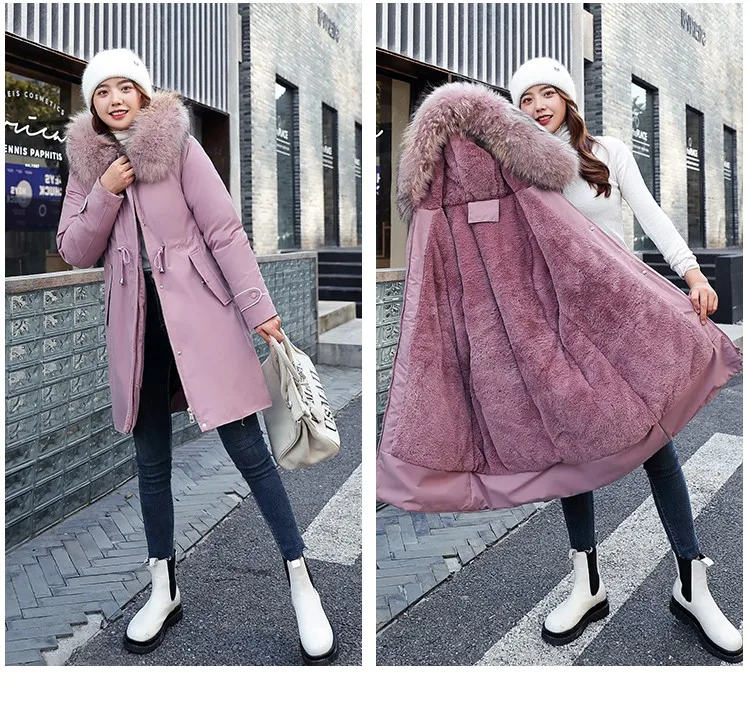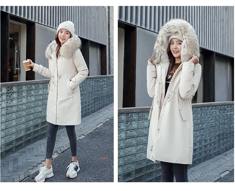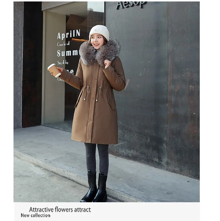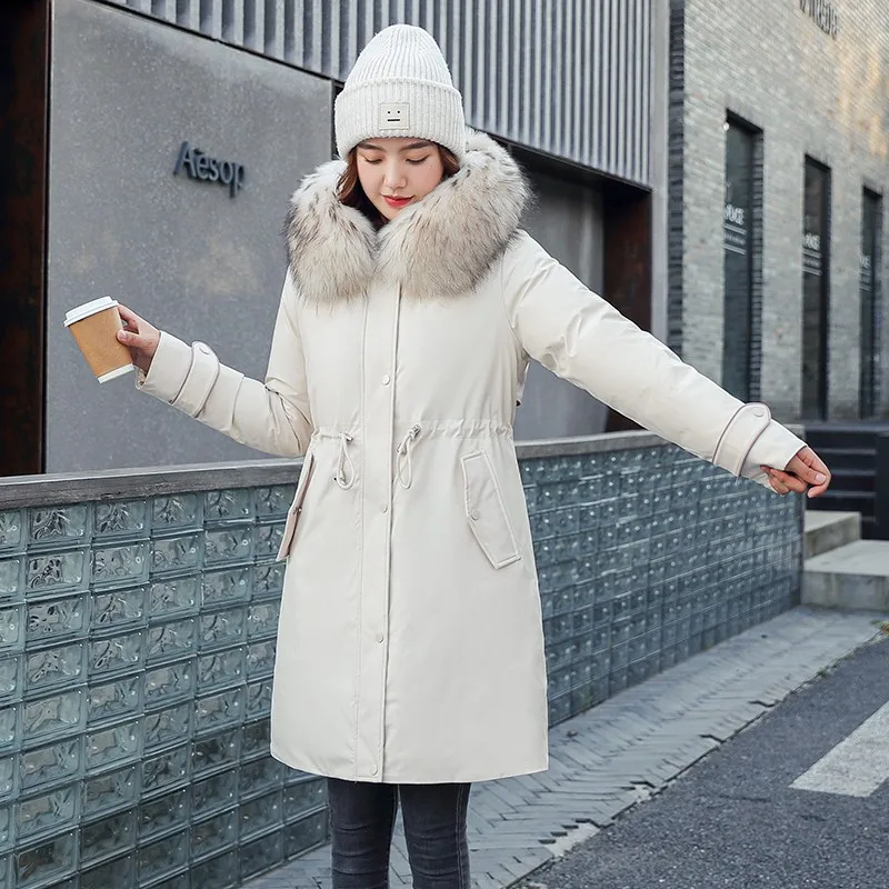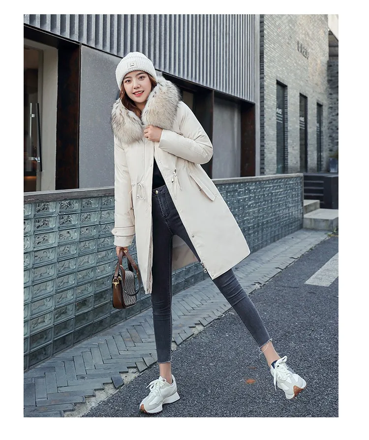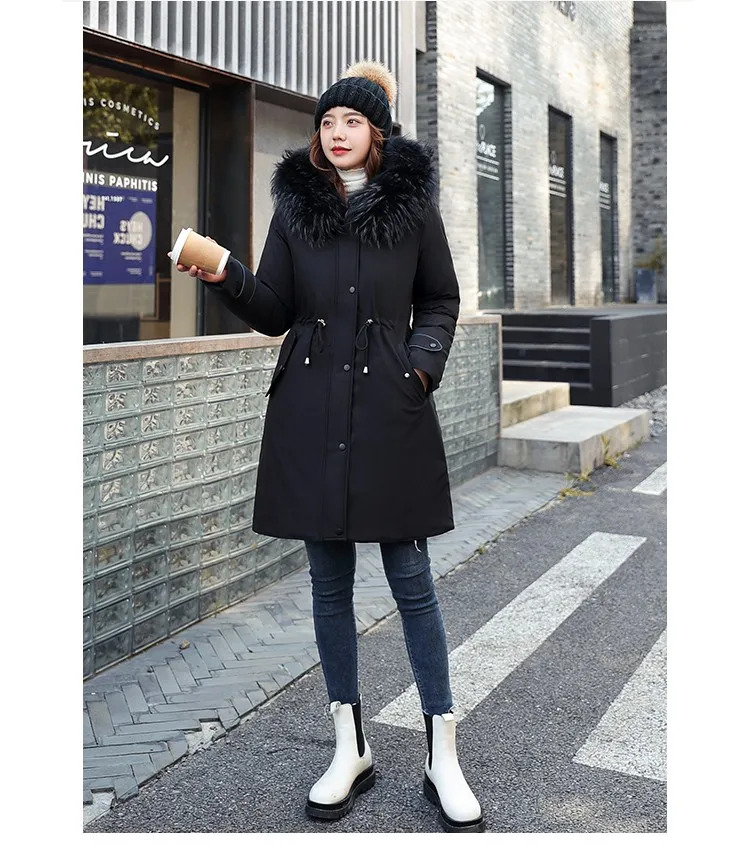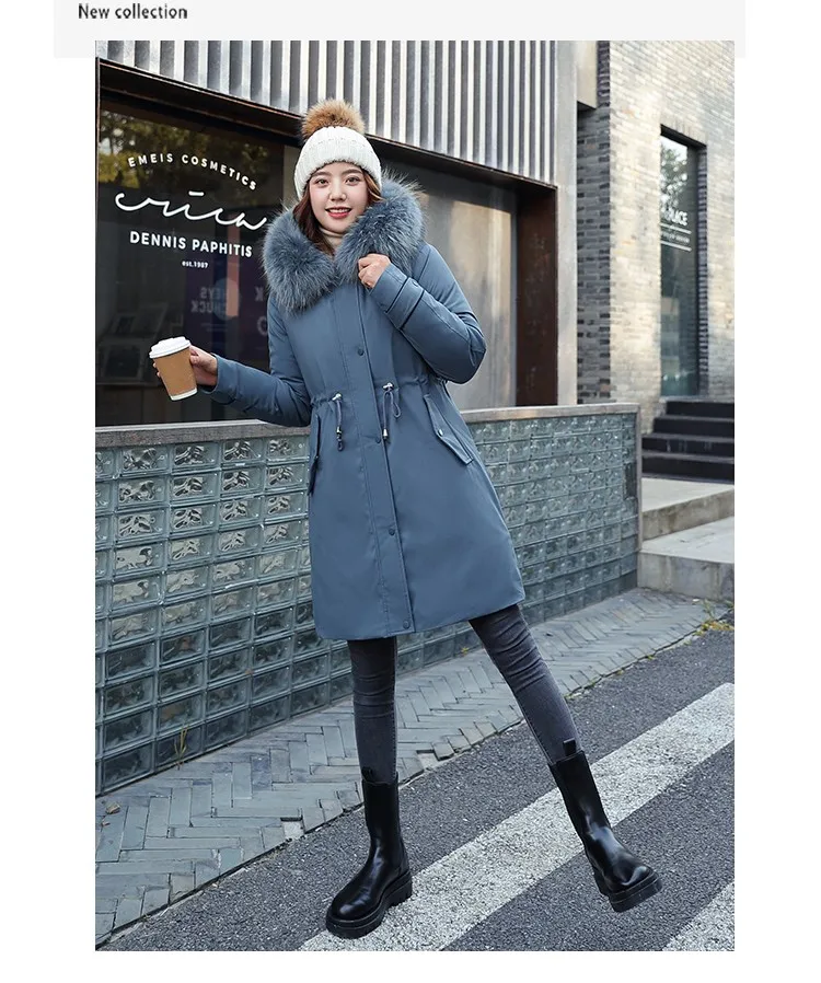 Пальто с подкладкой из 2021 хлопка, зимняя куртка для женщин, большие размеры, тонкое длинное пальто, женская модная большая парка с меховым капюшоном, пальто для женщин