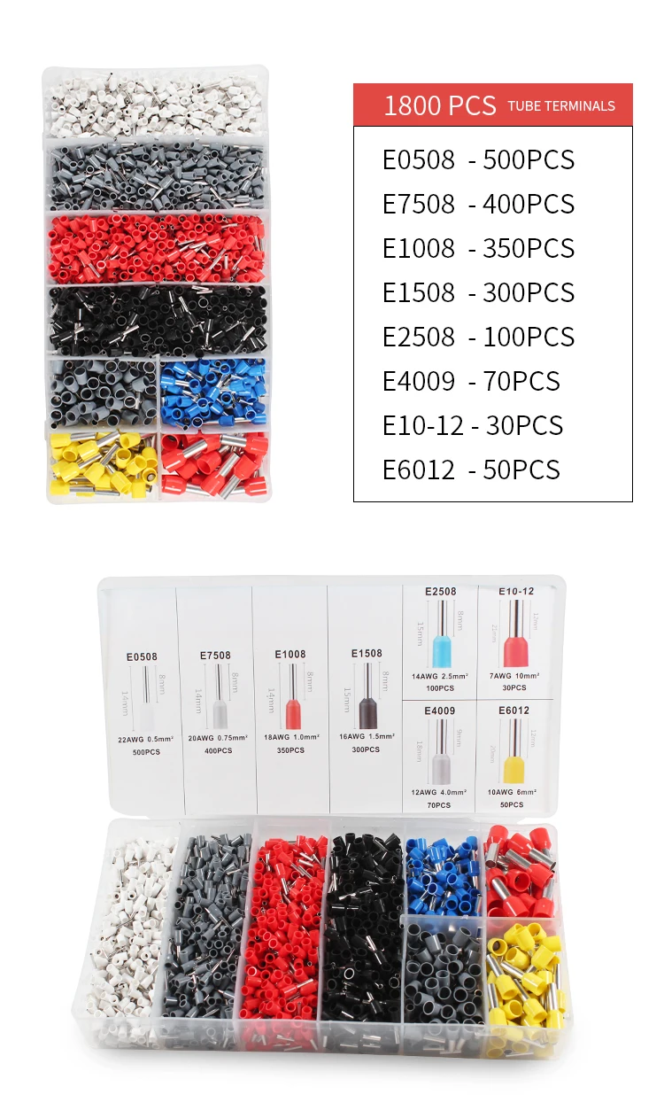 E0508 AWG22 0.5mm м² E7508 AWG20 0.75mm м² E1008 AWG18 1.0mm ² E1508 AWG16 1.5mm м² E2508 AWG14 2.5mm ² E4009 AWG12 4.0mm м² E10-12 AWG7 10.0mm м² E6012 AWG10 6.0mm ²