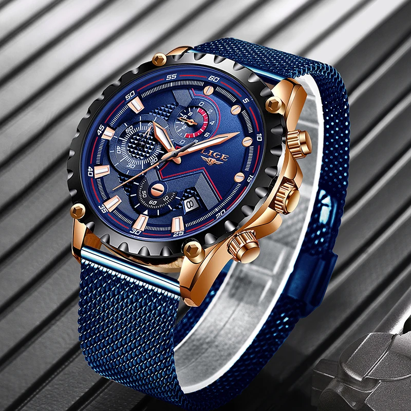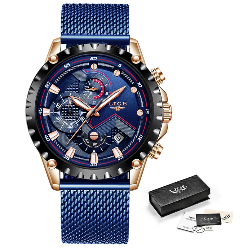 LIGE новые часы. Все синие сетчатые золотые часы с ремешком. это стильные деловые часы и часы для отдыха. с хронографом, автоматическим календарем, водонепроницаемым, противоударным, светящимся и другими функциями; подходит для всех случаев. браслет из нержавеющей стали очень удобен на запястье. Часы инструмент для звеньев цепи позволяет установить длину браслета самостоятельно