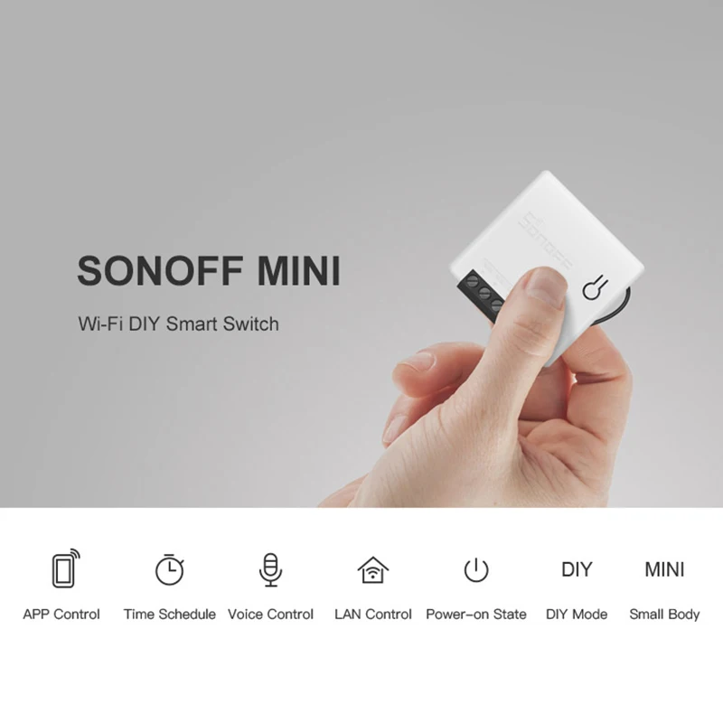 Это миниатюрный и компактный умный переключатель «сделай сам», используемый для разных видов переключателей, даже самой маленькой коробки переключателей стандарта ЕС. Удобно автоматизировать вашу бытовую технику с помощью приложения eWeLink с помощью смартфона, планшета или голосовых команд. Поддержка подключения внешнего переключателя света, не способного автоматически вернуться назад для легкого управления подключенными устройствами в вашем доме, как на телефоне, так и прямо от стены. Он поддерживает режим «сделай сам» (разработан для разработчиков), который позволяет пользователям интегрировать MINI во всемирную вечерние систему управления умным домом с открытым исходным кодом для достижения управления LAN без облачного обслуживания, например, home Assistant, опенхаб, иоброкер. И т. Д.