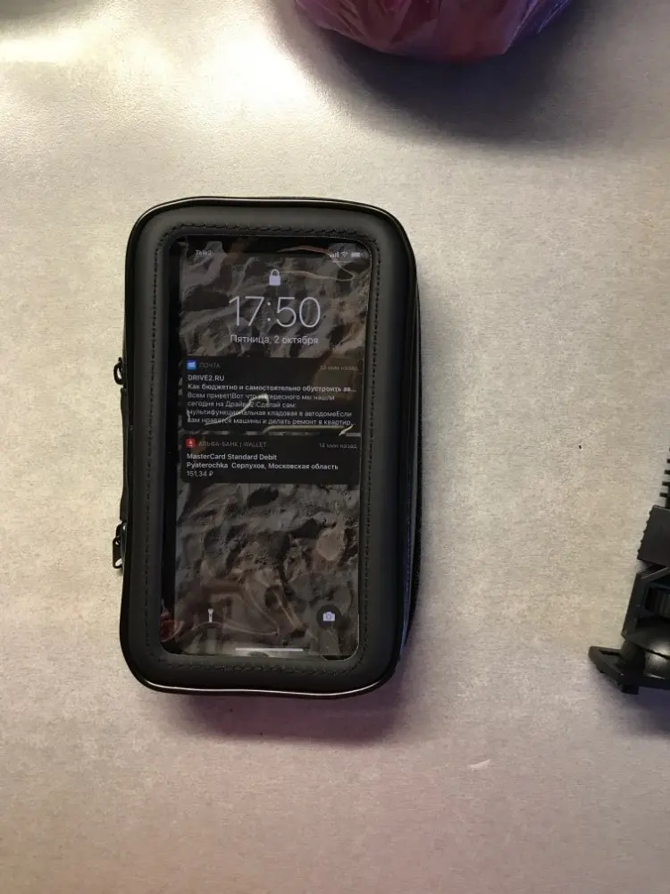 Сегодня получил! Заказал 11.11., получил 09.12. в почтовом отделении Ростов Дон. XL размер. Samsung A50 поместился, есть подложки... К нажатию пальцев реагирует... Вот только крепление футляра к кронштейну - УЖАС!!! Даже без телефона выпадает из кронштейна... Но за такие деньги пойдёт. Придётся мудрить стяжками к кольцу на футляре, чтобы не потерять при движении на мото... Большое спасибо продавцу!!!