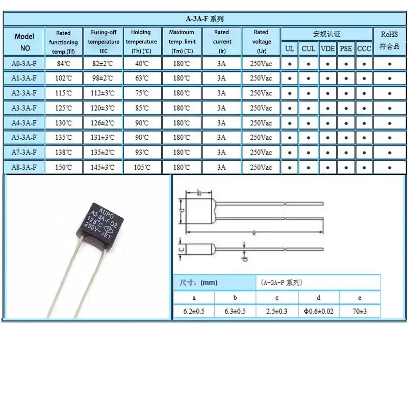 Термопредохранитель, черный квадратный, 1 А, 2 А, 3 А, 5 А, 250 В, отсечка 84, 102, 115, 125, 130, 135, 145, 150 градусов, светодиодный предохранители, контроль температуры