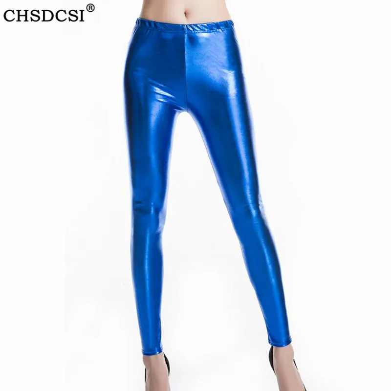 Женские блестящие леггинсы CHSDCSI, из искусственной кожи, со средней талией, длиной до щиколотки, брюки фитнес-ноги