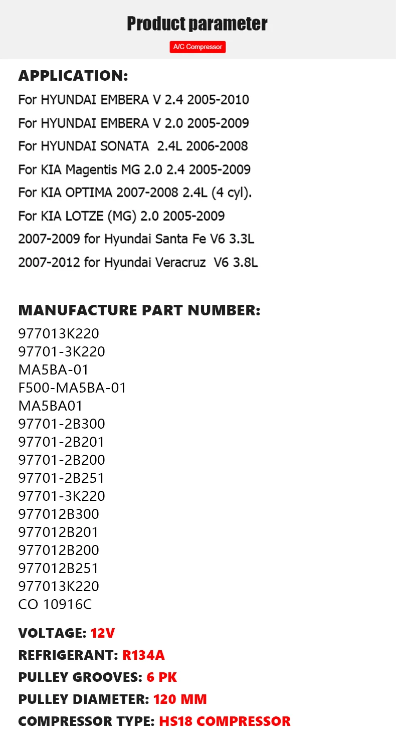Для HYUNDAI SONATA EMBERA Компрессор переменного тока для KIA OPTIMA LOTZE Magentis 977012B201 97701-3K220 977013K220 F500-MA5BA-01 977012B251
