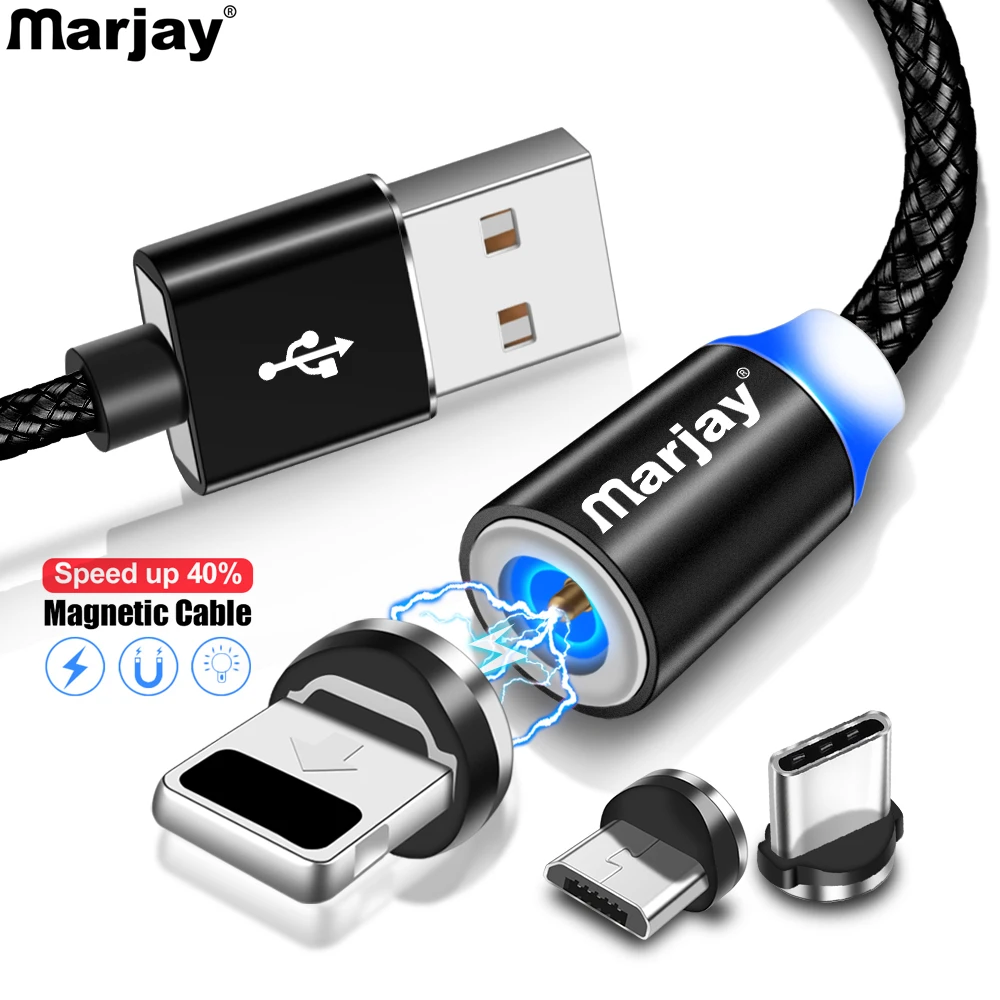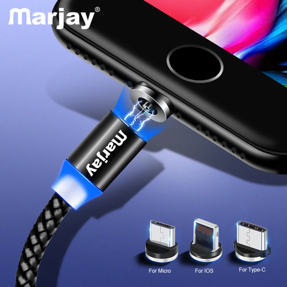 Магнитный зарядный кабель Marjay со светодиодной подсветкой, зарядный кабель Micro USB Type-C с магнитным разъемом USB для iphone X, 7, 8, 6, Xs Max, XR, Samsung S9, зарядное устройство