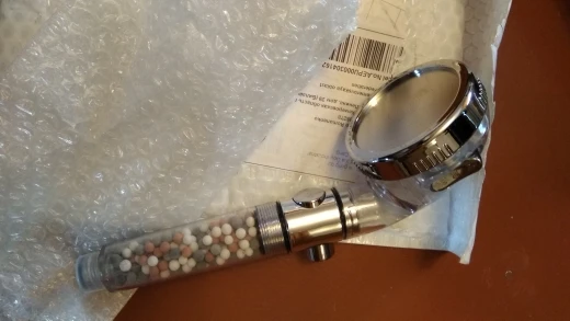 Упаковка посылки простая, "пупырки" и в почтовом пакете. Соединения герметичные, на вид нормальные и нигде не люфтит. У насадки в сборе резиновые и силиконовые прокладки. Камешки "фильтра" засыпаны не полностью на весь объем, а с неьольшим запасом пространства под крепление винтовое, в котором непонятно зачем дополнительная силиконовая прокладка. Распылитель непонятно из чего, хотя по виду как металлический, вытаскивается отдельной круглой пластиинкой, по виду чистить будет легко. А вот сам корпус насадки в легких потортостях и миницарапинах, возможно это дизайн - "антискользин в руках")