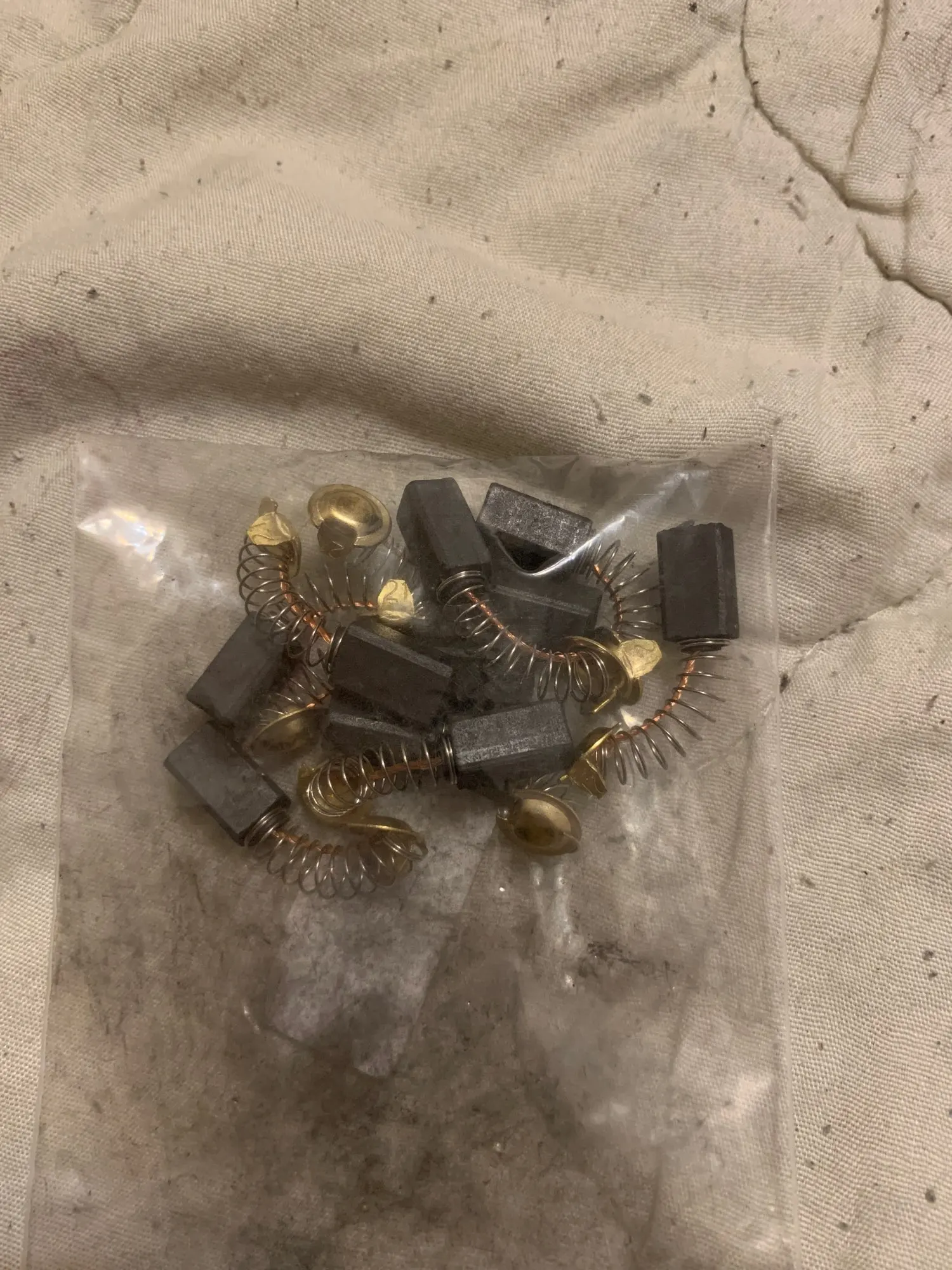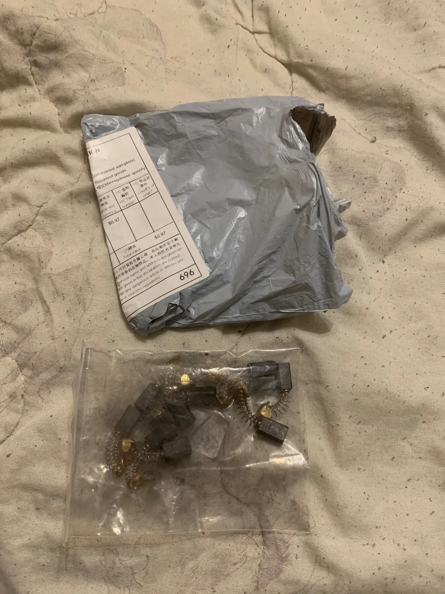 Размер точен. Длина пружины щётки модели С (13×8×5 мм) около 19 мм. Пружины хорошие, из толстой проволоки. У пары щёток контактная пластина держится на соплях, надо перепаивать. Сами щётки все целые. Упаковка - пакетик с зип-замком и почтовый пакет. Доставка Cainiao Super Economy (UB..HK). Заказ сделан 14 октября, отправлен 17-го. В пути 33 дня.