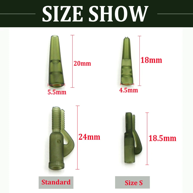 Хвостовые конусы обычно используются со свинцовыми зажимами для установки защитного болта. Но они также идеально подходят для использования в качестве рукавов на волосах, всплывающих, Chod и вертолетных установках.