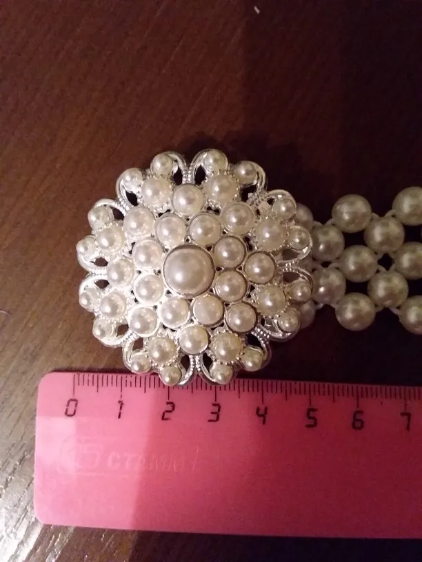 Товар соответствует фото. Жемчуг кстати не настоящий, но пояс очень красивый. Спасибо продавец товар до меня дошёл целым. Упакован в прозрачную упаковку. Рекомендую, кстати пояс эластичный немного растягивается. Застегнуть можно чётко по размеру.