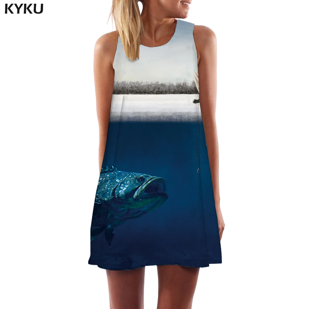 Платье женское в стиле бохо KYKU, Брендовое платье с рыбками в стил...