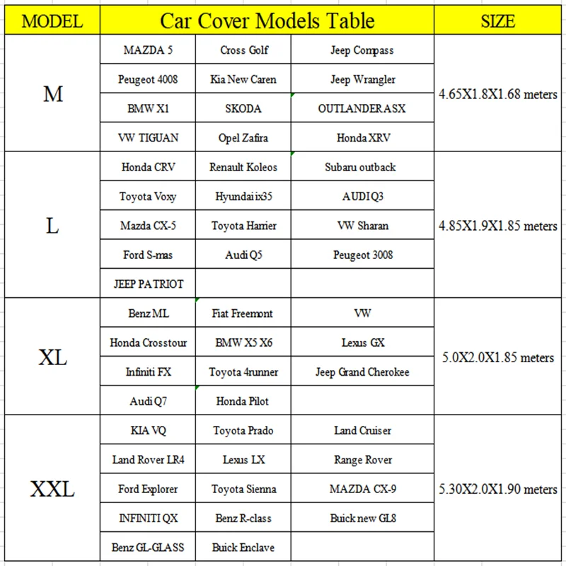 Особенности: Автомобильный чехол может эффективно предотвратить вредные УФ-лучи, грязь, пыль, снег, мороз и т. Д. Изготовлен из водонепроницаемой нейлоновой ткани, дольше, чем другие материалы в ту же погоду. Поставляется с 6 флуоресцентными светоотражающими полосками, которые защищают безопасность вашего автомобиля в ночное время. Он эффективно защищает от пыли, сохраняя автомобиль внутри и снаружи чистым и аккуратным. Есть 4 разных размера автомобильных чехлов, которые вы можете выбрать для удовлетворения различных потребностей. M: 4,65x1.8x1. 68 метров Замена для Мазда 5 Замена для Cross Golf Замена для Jeep Compass Замена для Пежо 4008 Замена для Kia New Caren Замена для Jeep Wrangler Замена для BMW X1 Замена для шкоды Замена для OUTLANDER ASX Замена для VW TIGUAN Замена для Опель Зафира Замена для Honda XRV L:4.85X1.9X1.85 метров Замена для Honda CRV Замена для Renault Koleos Замена для Subaru outback Замена для Тойота Вокси Замена для Хендай ix35 Замена для AUDI Q3 Замена для Мазда CX-5 Замена для Toyota Harrier Замена для VW Sharan Замена для Ford S-mas Замена для Ауди Q5 Замена для Пежо 3008 Замена для JEEP PATRIOT XL:5.0X2.0X1.85 метров Замена для Benz ML Замена для Fiat Freemont Замена для VW Замена для Honda Crosstour Замена для бмв Х5 х6 Замена для Lexus GX Замена для Infiniti FX Замена для Jeep Grand Cherokee Замена для Toyota 4runner Замена для Audi Q7 Замена для Honda Pilot XXL: 5,30X2,0x1,90 Замена для KIA VQ Замена для Toyota Prado Замена для Land Cruiser Замена для Land Rover LR4 Замена для Lexus LX Замена для Range Rover Замена для Ford Explorer Замена для Toyota Sienna Замена для Мазда CX-9 Замена для INFINITI QX Замена для Benz R-class Замена для Buick new GL8 Замена для Benz GL-GLASS