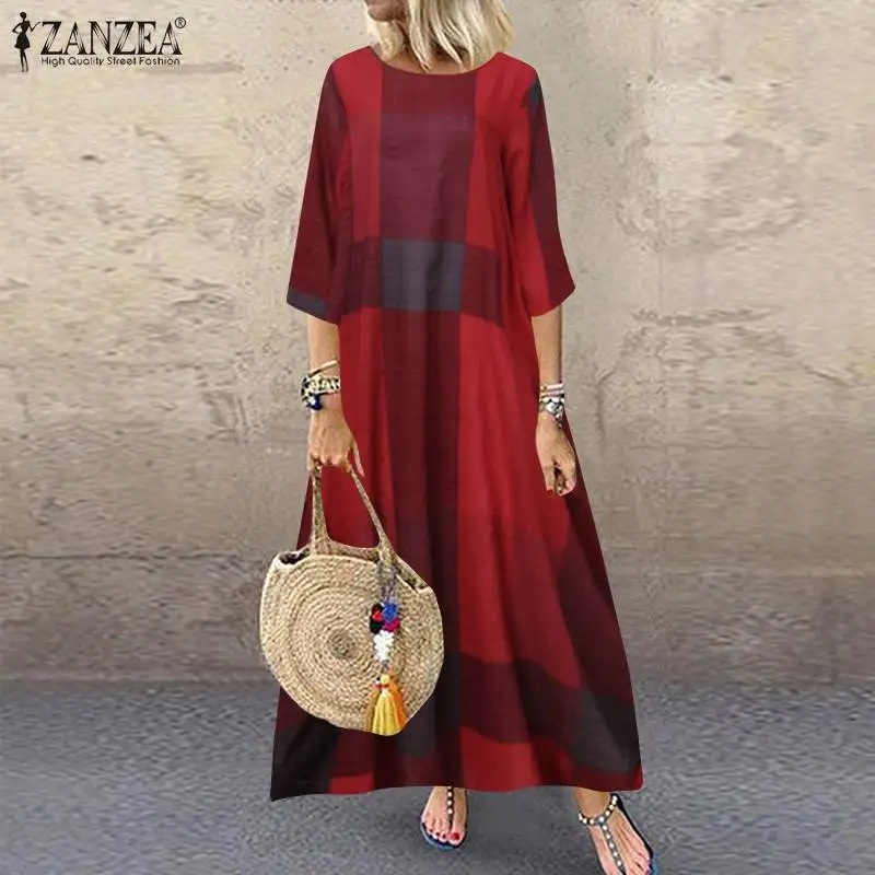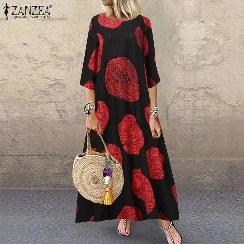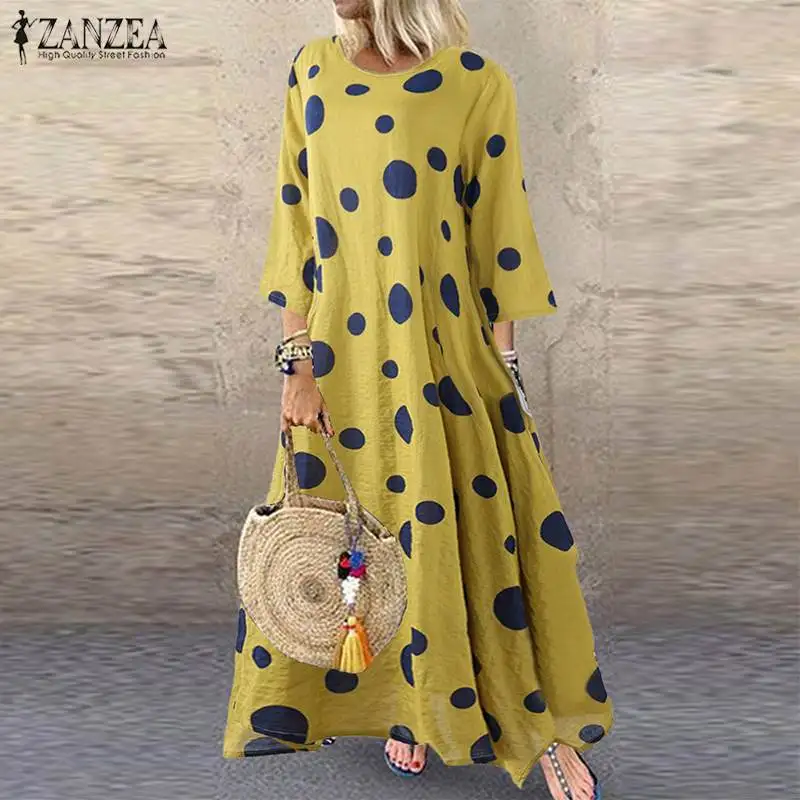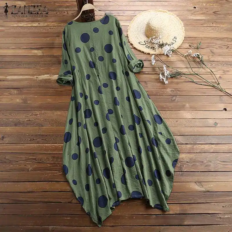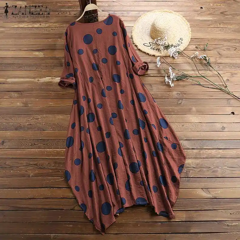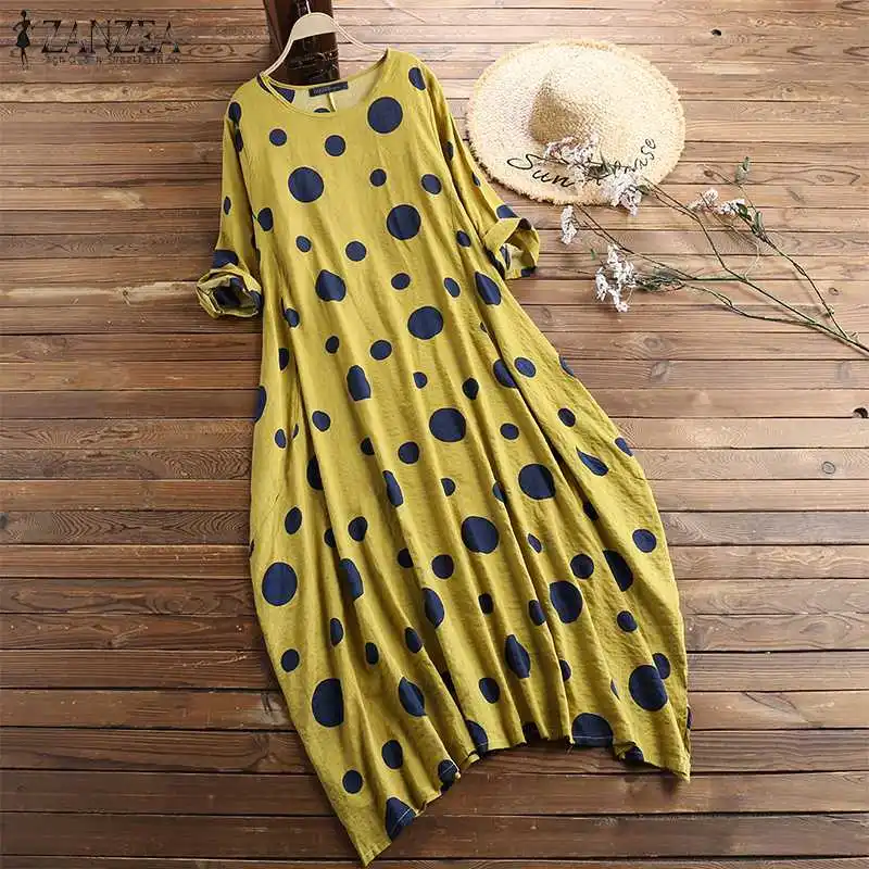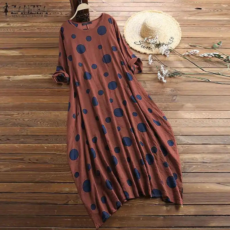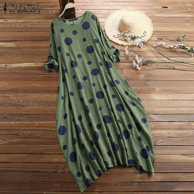 Осеннее длинное платье в горошек ZANZEA, винтажное женское платье из хлопка и льна, женский сарафан, 34