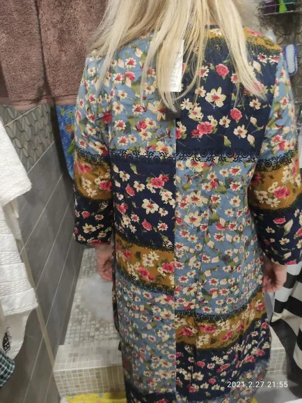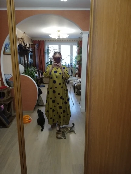 Симпатичное платье - летнее или для дома. Ткань натуральная, лёгкая. Размер соответствует меркам в описании! Ориентируйтесь на обхват груди! У меня полные руки, волновалась, что будет малО, но оказалось нормально. Форма платья не А-образное, а расширенное на бедрах, затем зауженное внизу. Шагать комфортно. Спасибо!