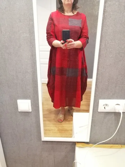 Платье отличное, ткань натуральная, немного "жатая". Очень люблю такой фасон. На росс.46-48 (ОТ85-ОГ98-ОБ102, рост 165) купила XL, т.к. люблю посвободнее. На мой рост - почти в пол. Не для театра или офиса, но вполне для летней прогулки или для дома. Рекомендую.Доставка до СПБ около 3 недель.