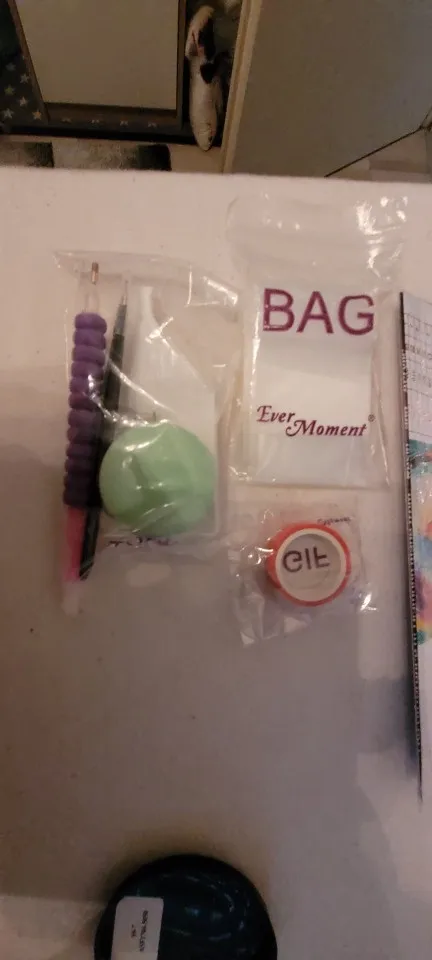 Посылка: холст, стразы, сумки, пинцеты, пластины, ручки и клей.