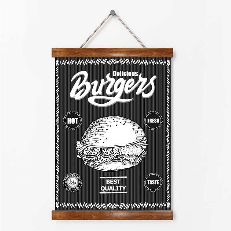 Холщовые постеры с изображением меню гамбургеров, картины с изображением еды, черные и белые картины, настенное украшение для ресторана, гамбургера, магазина, Картина на холсте