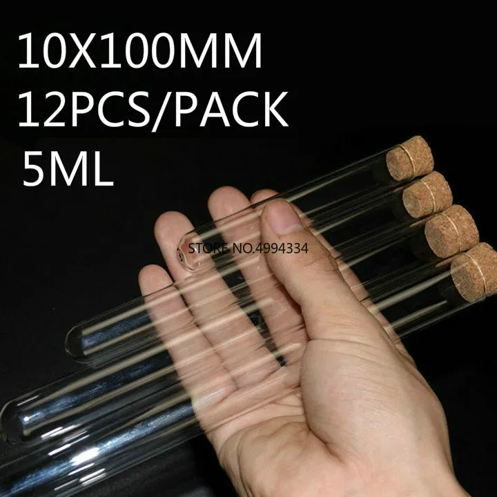 12 шт./лот 10x100 мм 5 мл прозрачные стеклянные пробирки с пробковой пробкой для лаборатории