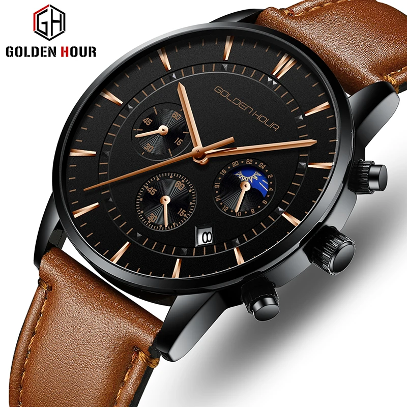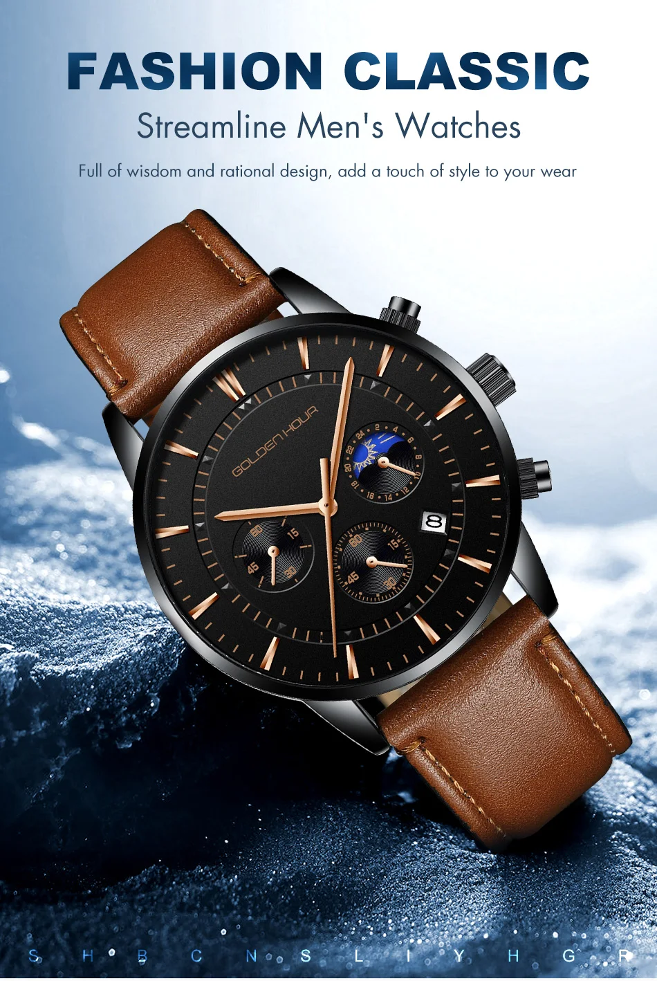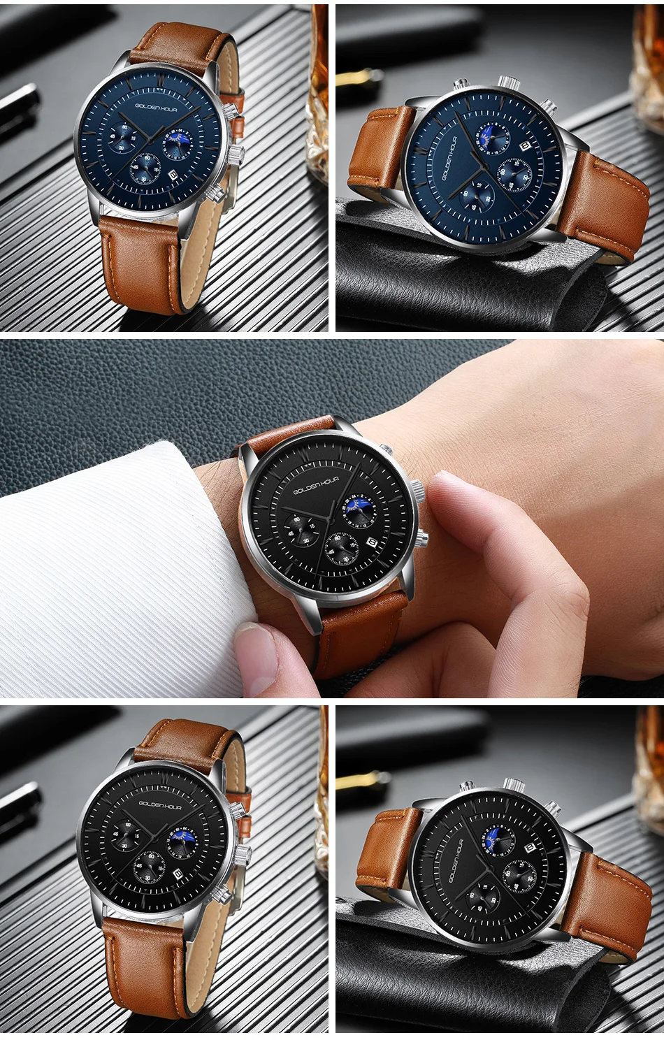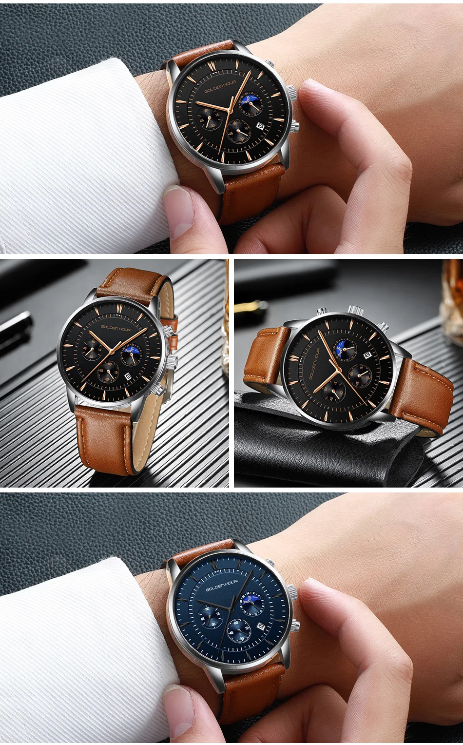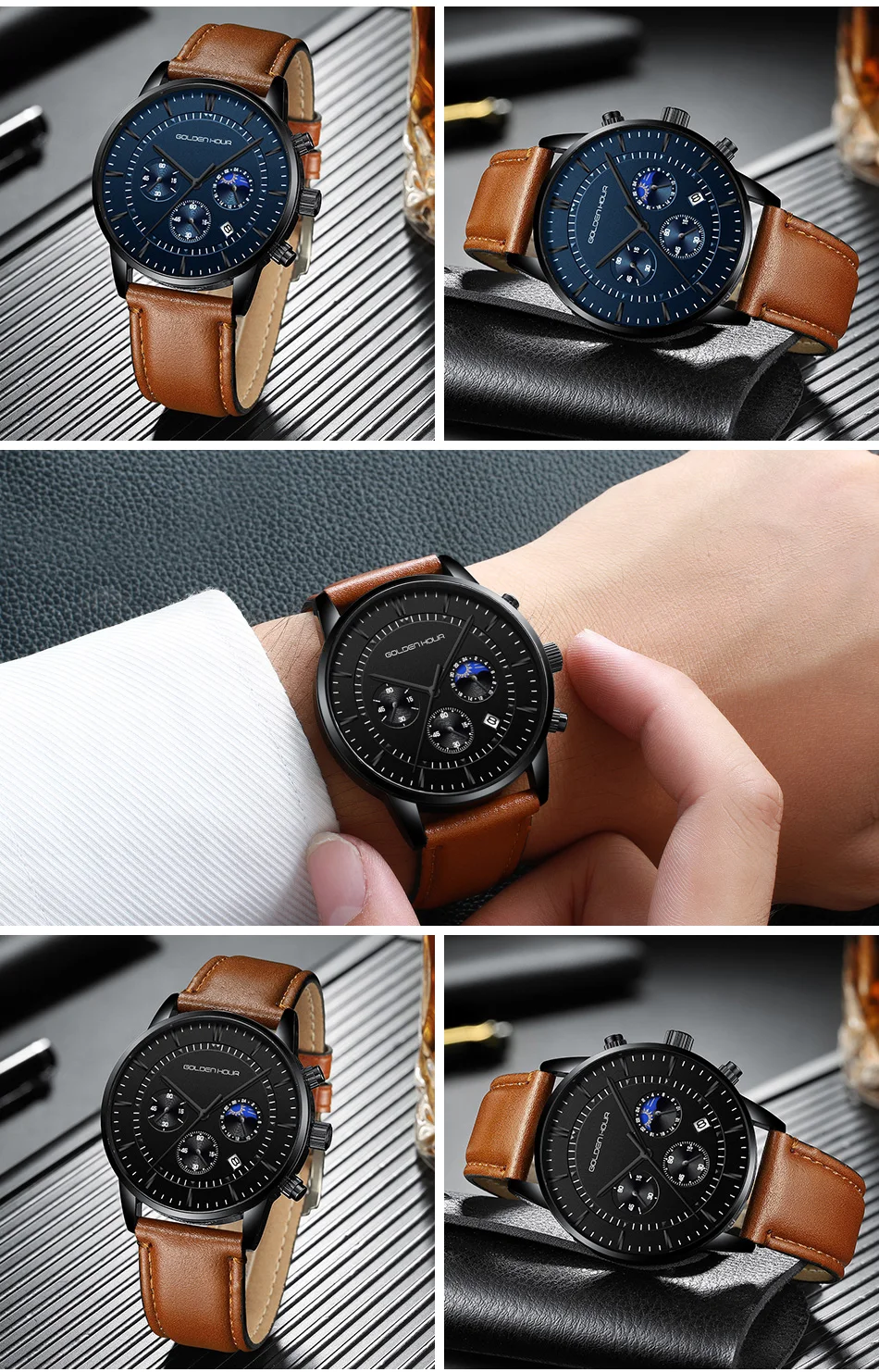 Часы наручные GOLDENHOUR Мужские кварцевые, брендовые Роскошные модные спортивные водонепроницаемые с кожаным ремешком