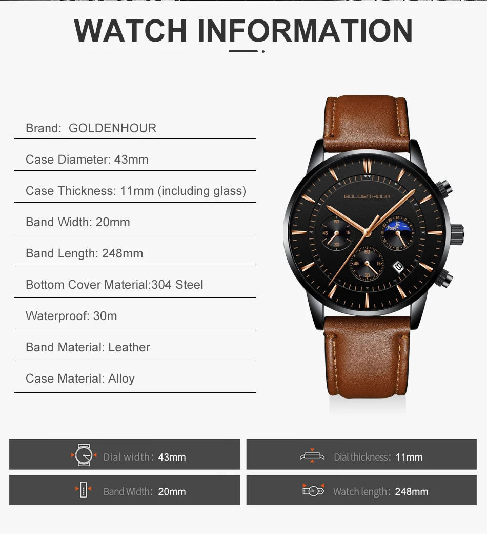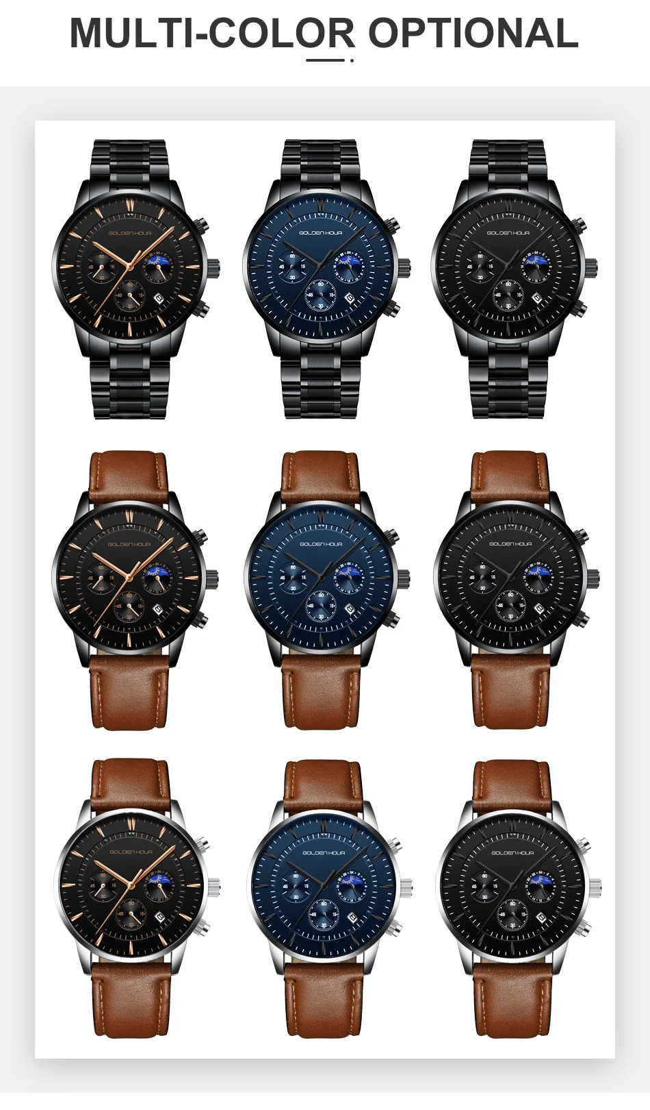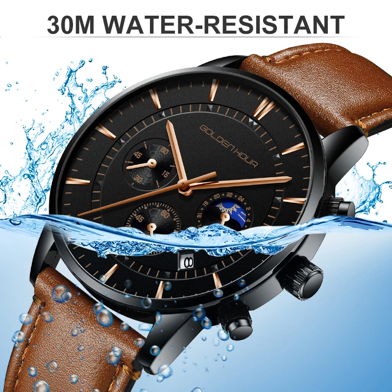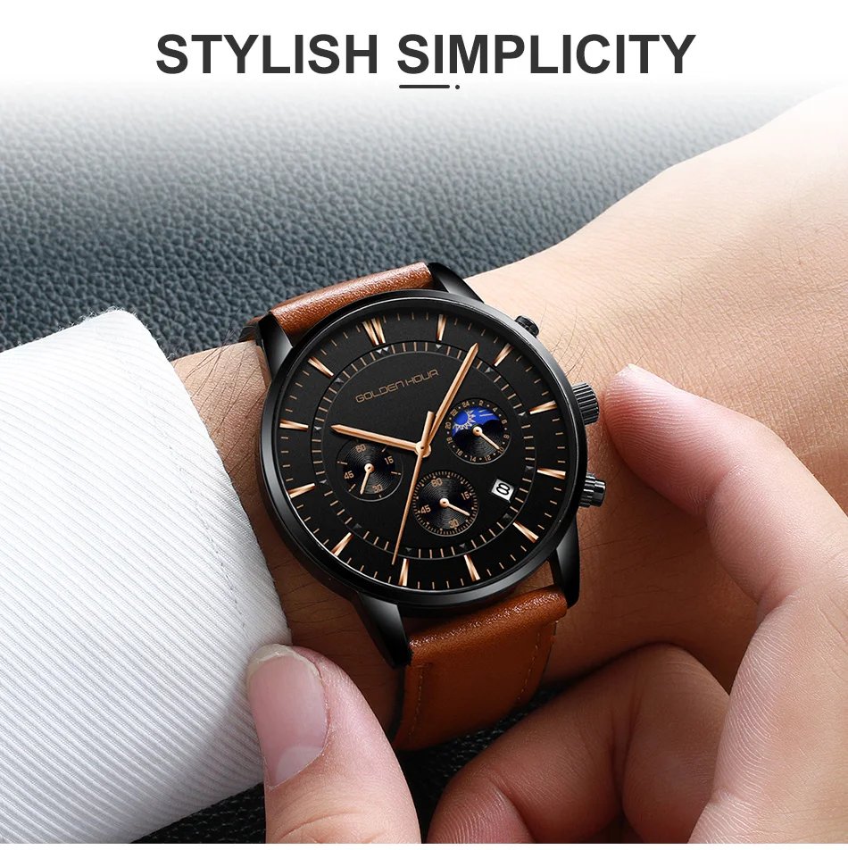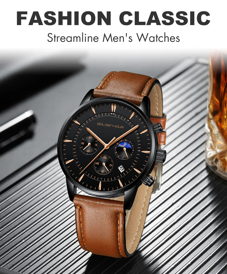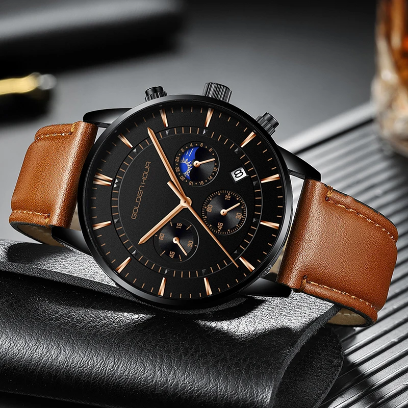 Часы наручные GOLDENHOUR Мужские кварцевые, брендовые Роскошные модные спортивные водонепроницаемые с кожаным ремешком