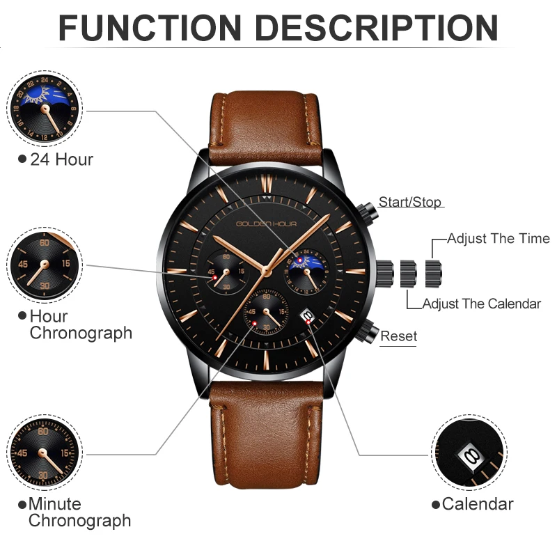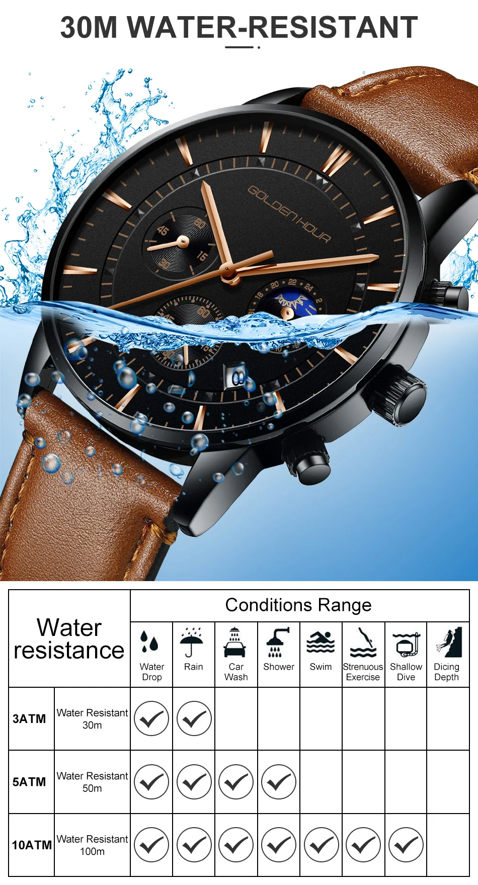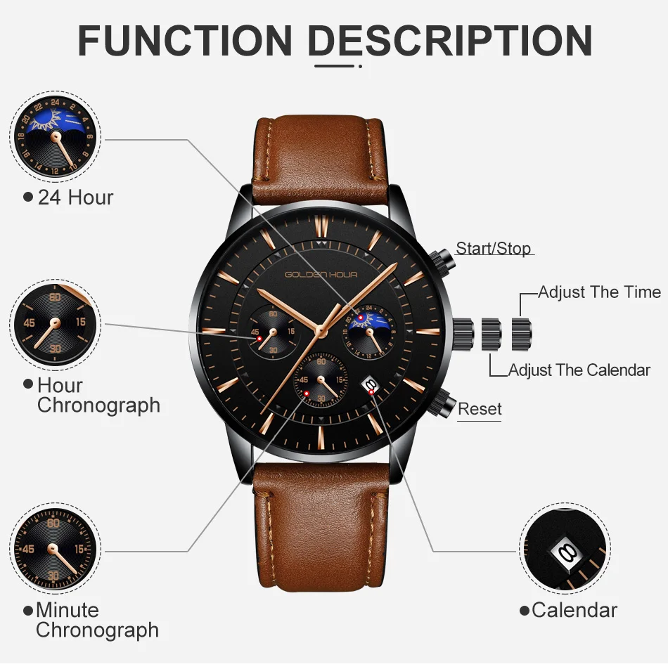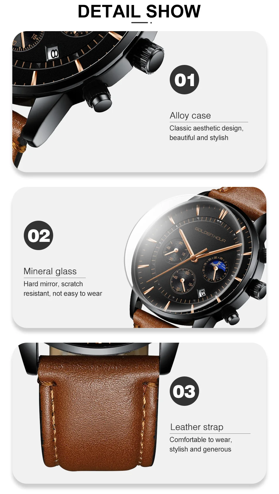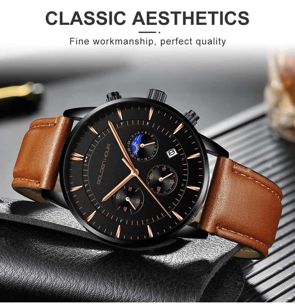Часы наручные GOLDENHOUR Мужские кварцевые, брендовые Роскошные модные спортивные водонепроницаемые с кожаным ремешком