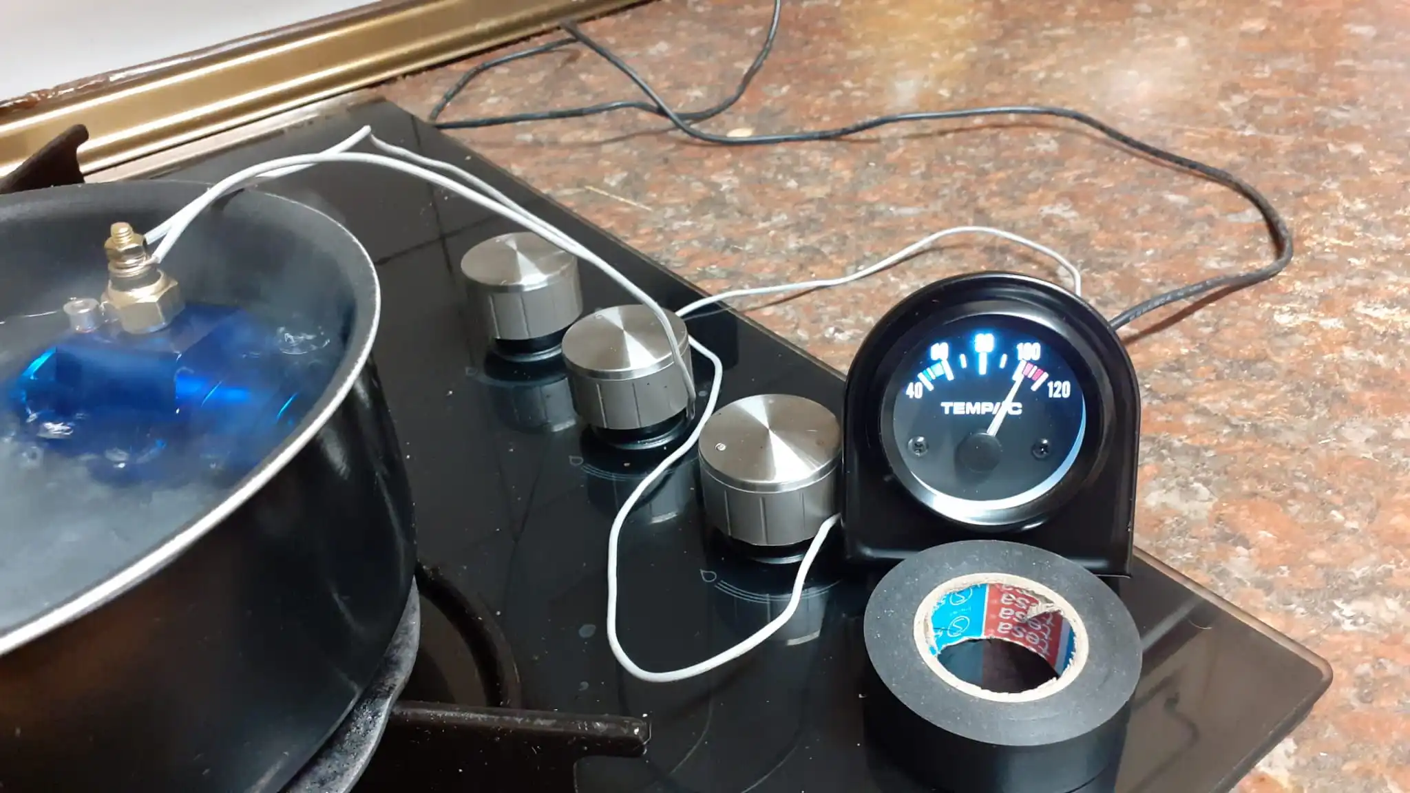 Протестировано кипятком, отметьте 100 °C. Если тефлон или силикон надеты на резьбу датчика (чтобы запечатать и не вымыть воду) Проверьте, так как нить должна сделать электрический контакт с массой синего алюминиевого корпуса. Если вы не контактируете с изоляцией тефлона, он не маркирует температуру. Я сварил кабель в нижней части датчика, подключенный к отрицательному массовому винту.