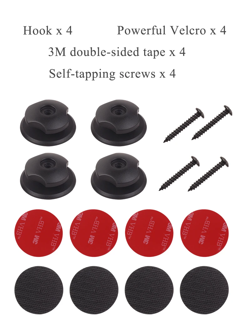 Package includeHook*4, Self-tapping screws*4, Double-sided tape*4, Adhesive Velcro*4