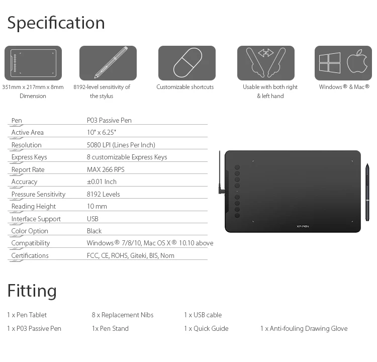 Планшет в большом, очень хорошем давлении и точности, прост в установке, материал хорошего качества и хорошего веса с более чем достаточным количеством места для рисования. Карандаш-это сложная вещь, потому что кнопки несколько чувствительны, но их легко устранить. Кнопки на боковой части планшета работают идеально и настраиваются. Кабель хорошего качества, карандаш поставляется с 9 запасными наконечниками, более чем достаточно. Единственная деталь заключается в том, чтобы попросить декларировать самую низкую цену, поскольку они взимают налоги.