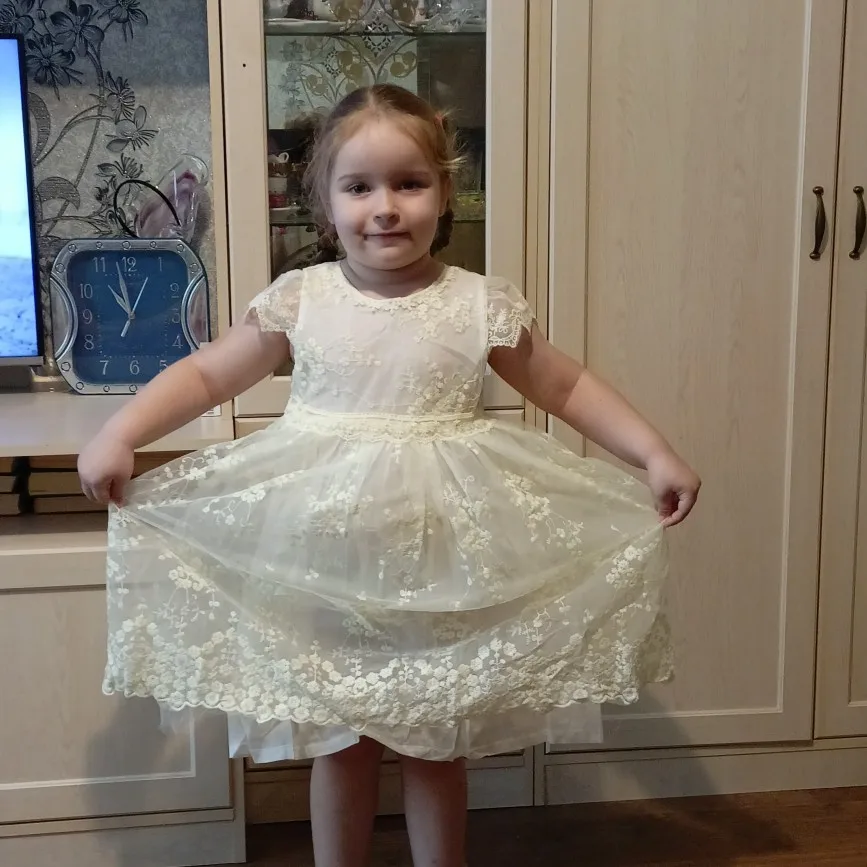платье в целом неплохое. первое впечатление, что на один раз. но при осмотре оно мне даже понравилось, тем более цена демократичная. на рост 122 на 7 лет в самый раз, на вырост уже не получиться. доставка ужасно долгая. Смотрится как на фото. Есть ленты, если надо немного утянуть. Дочка не полная, но и не худая, влезла в платье хорошо.