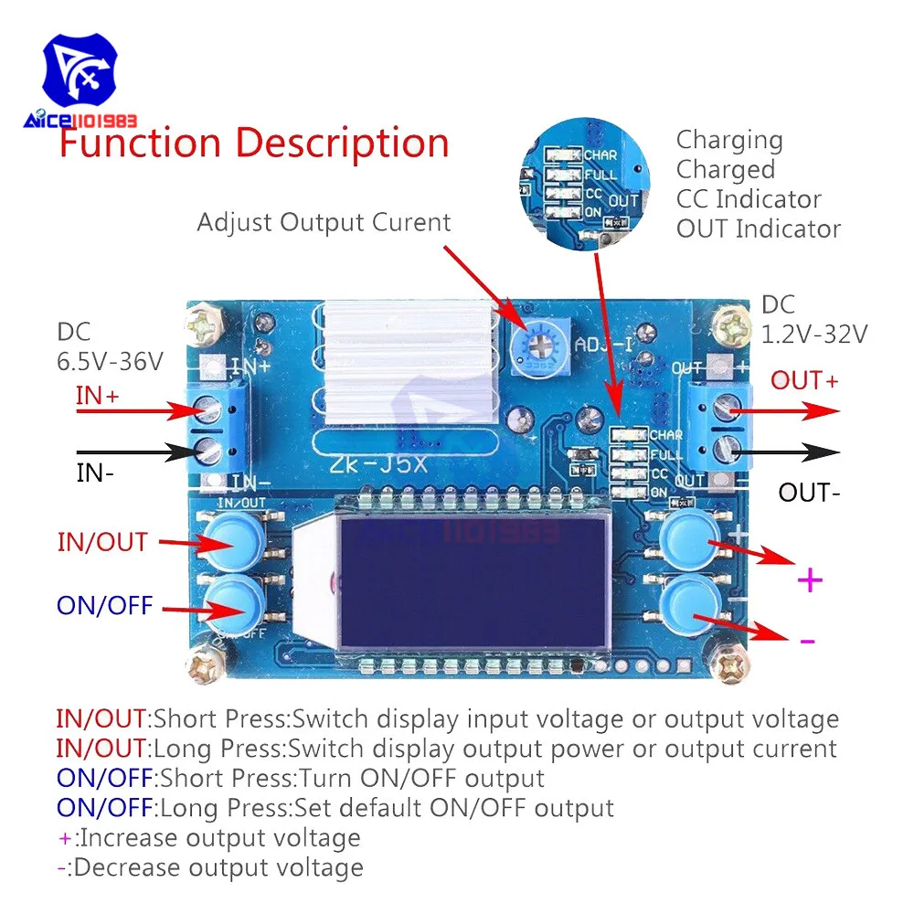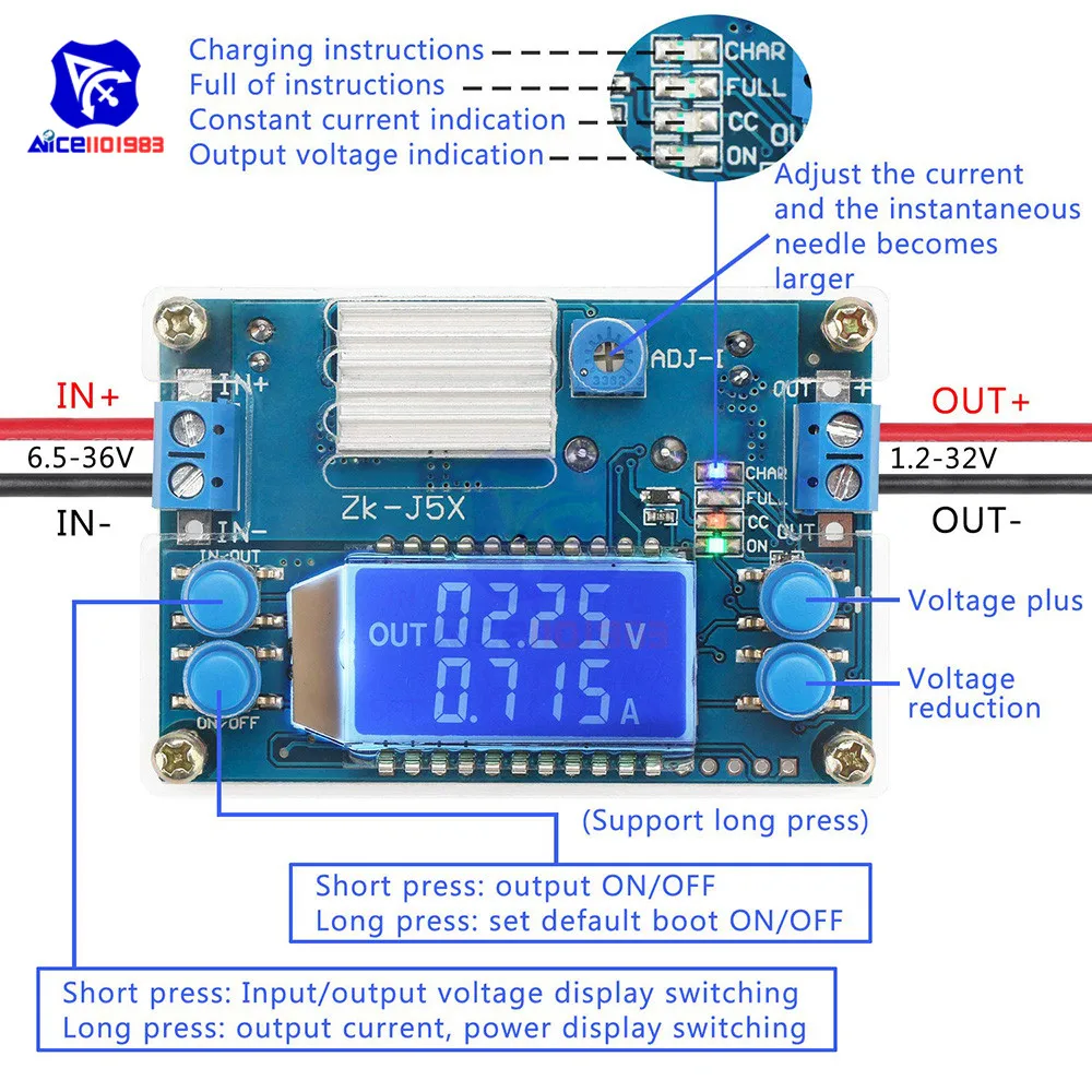 Описание:Этот элемент представляет собой модуль понижающего питания постоянного тока с регулируемым постоянным напряжением и ЖК-дисплеем. HD-дисплей входного напряжения и выходного напряжения, тока, мощности и состояния дисплея. Регулируемое стабильное выходное напряжение и ток. Установите выходной ток для удовлетворения спроса. Может использоваться как обычное модуль питания buck, зарядное устройство и светодиодный драйвер постоянного тока. Простой и эффективный, практичный.Особенность:Высоковольтный устойчивый терминалС высококачественной акриловой оболочкойПоддержка вывода данных о полной нетрудоспособностиПоддержка защиты от обратного ходаПоддержка защиты от короткого замыканияПоддержка включения выводаЖК-экран HD дисплейПоддержка функции зарядкиПоддержка выбора выходаПоддержка входного напряжения дисплеяПоддержка дисплея выходное напряжение, ток, мощностьПоддержка индикатора рабочего состоянияОдновременно отображаются несколько параметровВысокий ток, низкий нагревПараметры:Рабочее напряжение: постоянный ток 6,5 В-36 вВыходное напряжение: постоянный ток 1,2 В-32 ВВыходной ток: 5А (требуется теплоотвод 4,5а; Стабильный в течение длительного времени 3,5 а)Выходная мощность: 75 Вт (75 Вт нужен радиатор; 50 Вт-для 3,5а)Диапазон отображения напряжения: 1,2 ~ 32 ВТочность отображения напряжения: +/-0,1 вРазрешение дисплея напряжения: 0,05 ВДиапазон отображения тока: 0 ~ 5AТочность отображения тока: +/-0,05 АРазрешение дисплея напряжения: 0,005aЭффективность преобразования: около 94%Рабочий ток: 30 мАПлавный стартер: Да (отказ при высокой мощности нагрузки)Защита от обратного хода: ДаЗащита от обратного потока: нет (рекомендуется подключать последовательно диод на 'OUT + ')Диапазон рабочих температур:-20 ℃ ~ 85 ℃Диапазон рабочей влажности: 0%-95% RHРазмер без оболочки: 68*47*26 ммРазмер с оболочкой: 70,5*48,4*30 ммРазмер радиатора: 20*14*6 ммКнопка/потенциометр/светодиодная информация:Длительное нажатие означает удерживание нажатия более 3 секунд.ВКЛ/ВЫКЛ: короткое нажатие, чтобы выбрать выходное напряжение. Длительное нажатие используется для восстановления настроек по умолчанию для следующего повторного питания.Вход/выход: короткое нажатие для переключения входного напряжения или выходного напряжения дисплея. Длительное нажатие используется для переключения выходного тока или выходной мощности дисплея.Кнопка «+»: используется для регулирования выходного напряжения. Увеличение выходного напряжения. При каждом нажатии кнопки для короткого нажатия выходное напряжение увеличивается на 0,05 В. Длительное нажатие может непрерывно увеличиваться. Увеличьте 0,1 в, 1 в непрерывном режиме, если держать длительное нажатие еще раз.Кнопка ' - ': используется для регулирования выходного напряжения. Снижение выходного напряжения. При каждом нажатии кнопки для короткого нажатия выходное напряжение снижается на 0,05 В. Длительное нажатие может непрерывно уменьшаться. Уменьшение 0,1 в, 1 в непрерывном режиме, если удерживать Длительное нажатие снова.ADJ-I потенциометр: Регулировка выходного тока. Увеличить выходной ток при вращении по часовой стрелке. Модуль переходит в выходное состояние постоянного тока, если ток нагрузки достигает заданного текущего значения. Включится красный светодиодный индикатор постоянного тока CC.На светодиодный: зеленый светодиодный. Ин