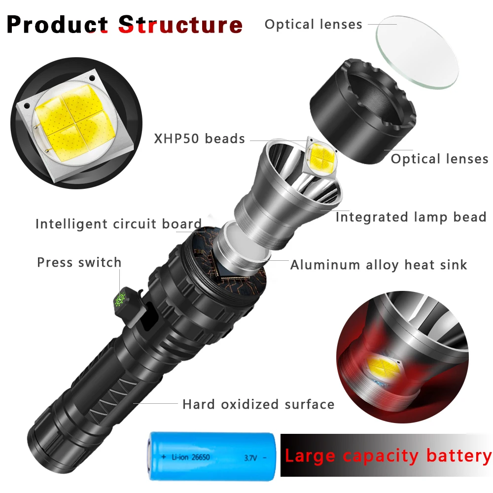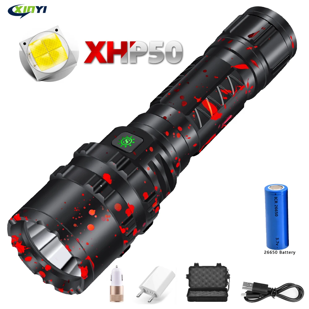 Мощный светодиодный фонарик XHP50, 18650 лм, водонепроницаемый фонарик, 5 режимов, для охоты, использования аккумуляторов 26650 и, для кемпинга