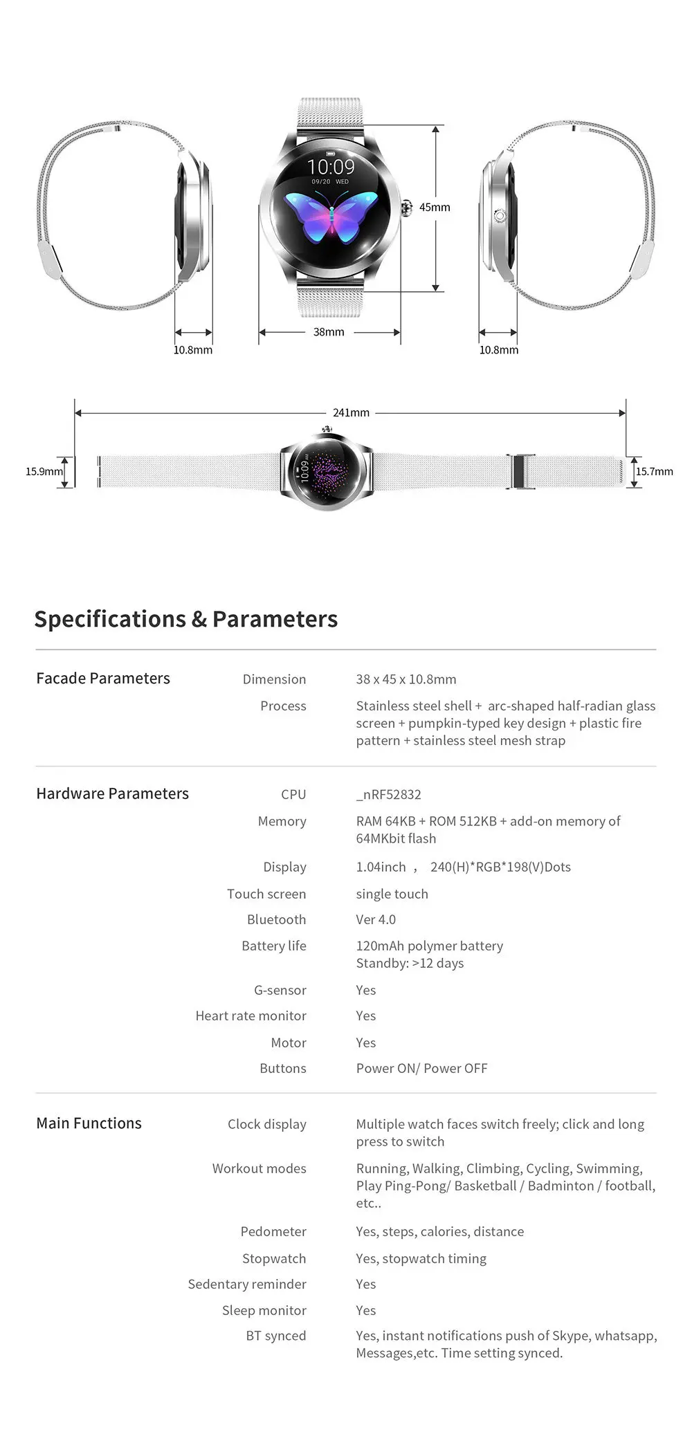 Особенности: * Цветной сенсорный экран 1,04 дюйма * Металл для основного корпуса * Аппаратная платформа: NORDIC NRF52832 * Встроенный аккумулятор 120 мАч, время ожидания около 15 дней * IP68 Водонепроницаемый * Пульсометр, физиологическое напоминание * Напоминание о умных звонках и сообщениях: звонки, Twitter, Facebook, Wechat и т. д. все они будут отправлены на дисплей на запястье и с предупреждениями о вибрации (если сообщение не напоминается, перезагрузите часы) * Разнообразие спортивных моделей, шагомер для просмотра в приложении, калории, расстояние * Поддержка версии iOS 8,1 и выше и версии Android 4,4 и выше * Дополнительные функции: монитор сна, пульсометр, монитор движения (шаги, расстояние, калории), шагомер, синхронизация сообщений, входящий вызов, будильник, вибрация Примечание: Носимые устройства отслеживают активность человека с помощью электронных датчиков и находятся на уровне потребительской электроники. Для определенных отклонений это нормально. Пользователь должен относиться к данным объективно. Пожалуйста, не сравнивайте с больничным оборудованием для чтения, это не медицинское устройство! Перед использованием отсканируйте QR-код в руководстве, чтобы загрузить приложение и подключить его к часам с помощью приложения.