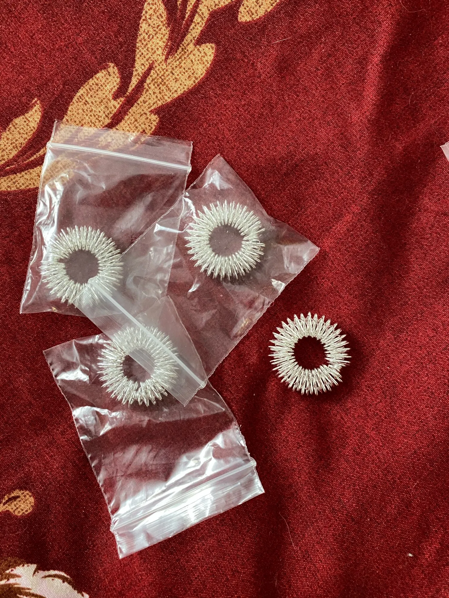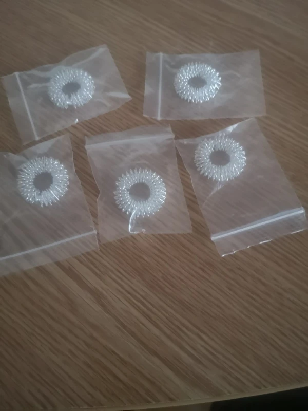 Доставка два с половиной месяца. Кольца из тонкой проволоки, все целые. Пользуюсь больше недели, интересные ощущения при массаже, будет ли какой эффект, не знаю, но есть чем заняться пальцы.