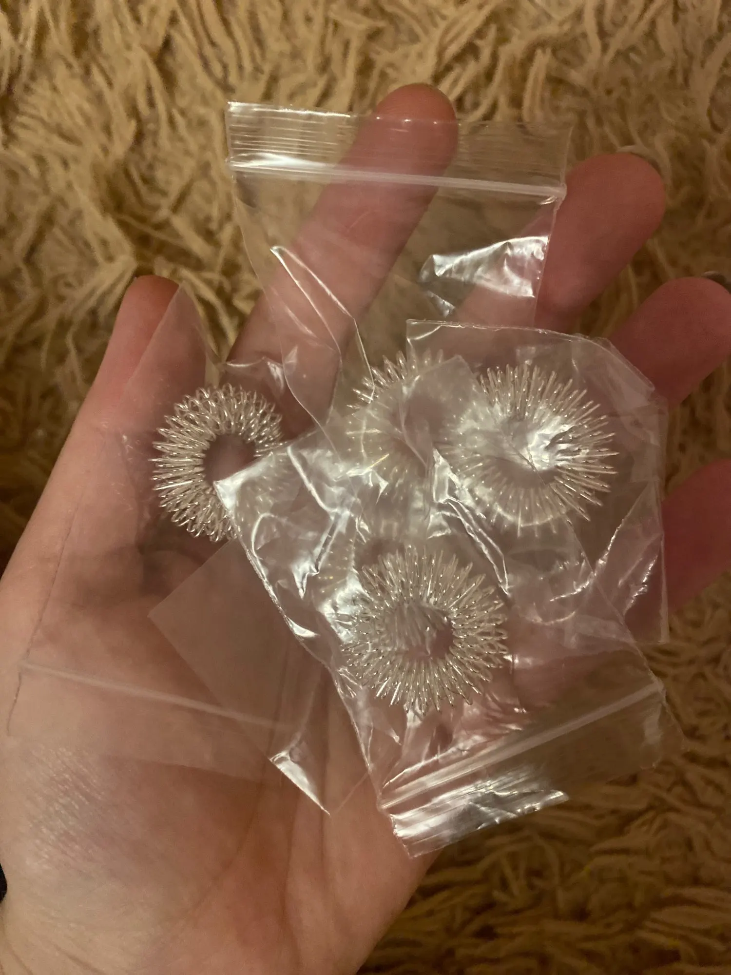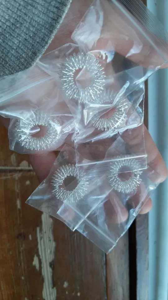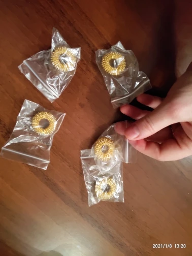 Колючки отличного качества. Не разлазятся и пока что не растягиваются. На взрослую руку, на пальцах даже туговато. Очень эффективно. На большую мужскую руку, говорит, что даже немного больно т.к. впиваются. Тугие. Свою функцию выполняют замечательно. Очень нравится после них эффект, на пальцах остаются следы от массажа. Приятные ощущения тепла и легкости. Имею другого качества су-джок, купленный в местном магазине. Огромная разница, тот и больше и мягче и металл толще и эффект намного слабее. Этот, то что надо! Действие проникающее, хорошо активирует точки. Покупала за $1.39. Размер на фоне спичечного коробка (фото) Продавец, молодец, отправил сразу. В Киев (Украина) прилетели за 20 дней с момента заказа (Нова Пошта). Трэк отслеживался всю дорогу. Буду у этого продавца покупать снова)