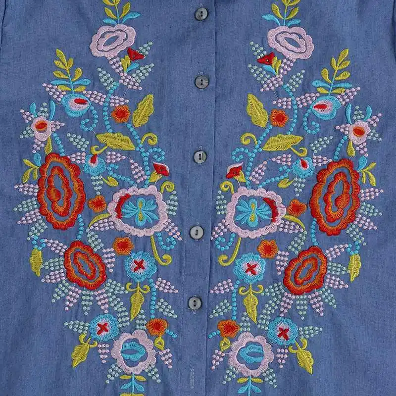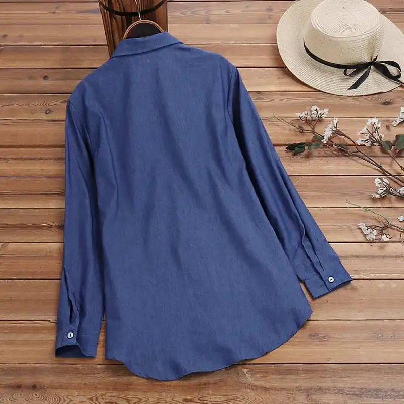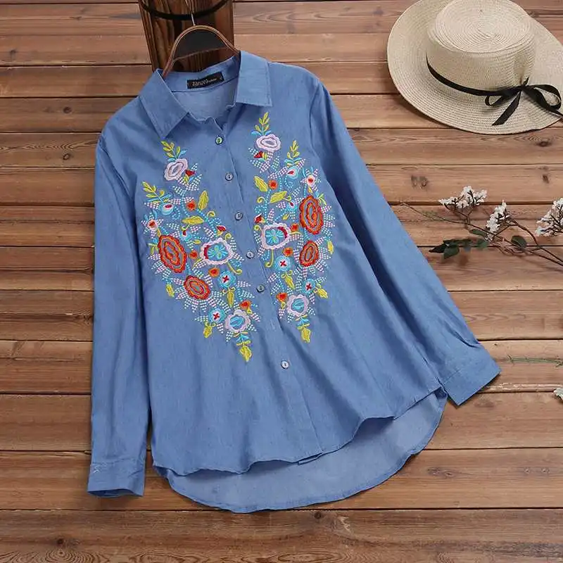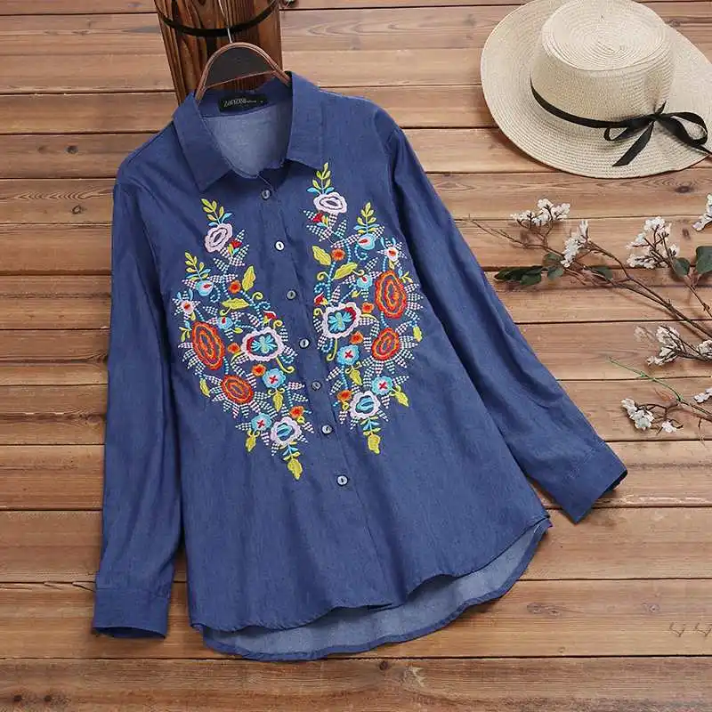 Осенняя джинсовая рубашка ZANZEA 2022, Женская туника с вышивкой, топы, модная вечерняя блузка с цветочным принтом, повседневные свободные блузки с отворотом и длинным рукавом