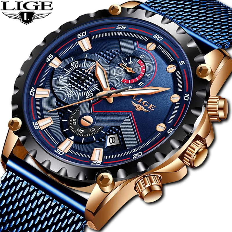 LIGE новые часы. Все часы с голубым сетчатым ремешком и золотым корпусом. Это стильные деловые часы и часы для отдыха. С хронографом, автоматическим календарем, водонепроницаемым, противоударным, светящимся и другими функциями; Подходит для всех случаев. Браслет из нержавеющей стали очень удобен на запястье. Инструмент для соединения часов позволяет установить длину браслета самостоятельно