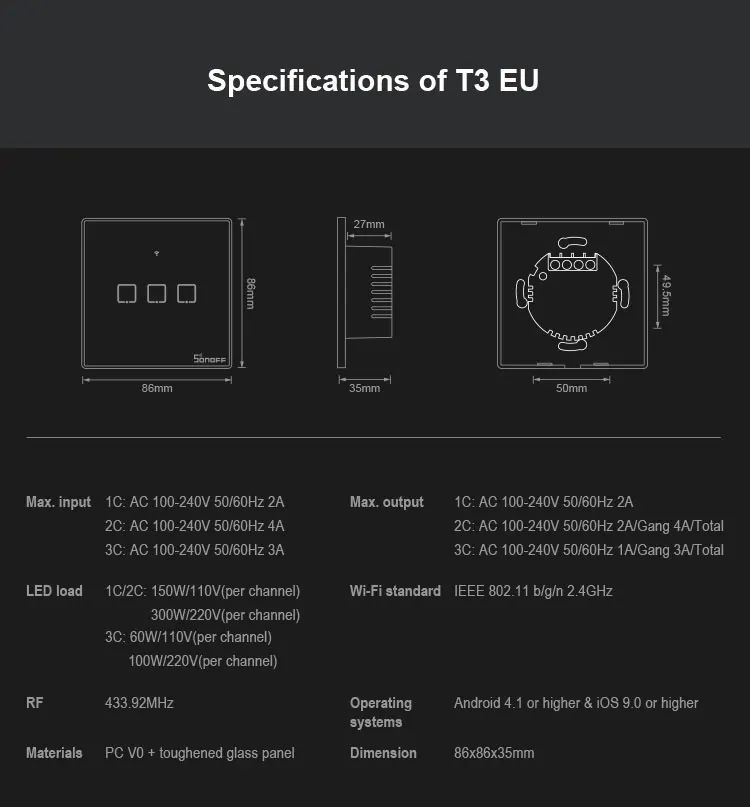 Смарт-переключатели Wi-Fi с 1-3 бандами делятся на T0 (ЕС, Великобритания и США), T1 (ЕС и Великобритания), T2 (ЕС, Великобритания и США) И T3 (ЕС, Великобритания и США). T3 доступен в черном цвете, а T0, T1 и T2 доступны в белом цвете. Дополнительно T1, T2 и T3 поддерживают пульт дистанционного управления 433 МГц.