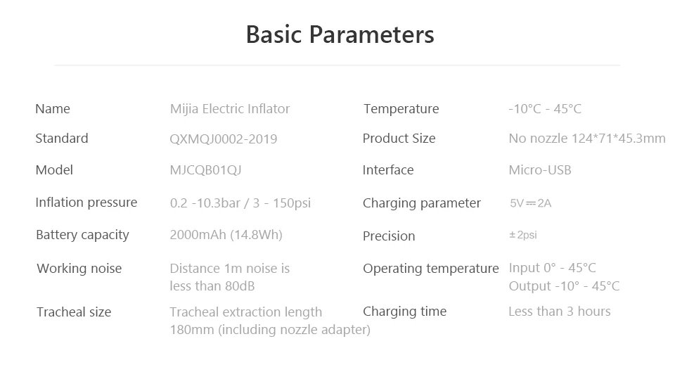 · Температура хранения: -10 ° C -45 ° C · Размер продукта: 124x71x45,3 мм (без воздушной трубки) · Модель продукта: MJCQ01QJ · Интерфейс зарядки: Micro-USB · Давление накачивания воздуха Диапазон: 0,2-10.3bar/3-150psi · Параметры зарядки: 5V-2A · Емкость аккумулятора: 2000 мА · ч (14,8 Вт · ч) · Точность датчика: ± 2psi · Рабочий Уровень шума: уровень шума менее 80 дБ от 1 метра · Рабочая влажность: Зарядка 0 ° C -45 ° C, разряд-10 ° C -45 ° C · Размер тяги: вытягивание тяги, длина 180 мм, включая насадку (без резьбы) адаптер · Время зарядки: менее 3 часов
