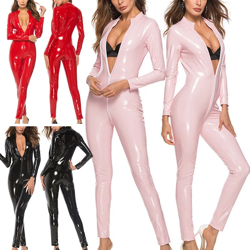 Однотонные Комбинезоны Костюмы Боди Женский длинный рукав костюм пляжного типа на молнии плюс размер Wetlook сексуальные женские Вечерние