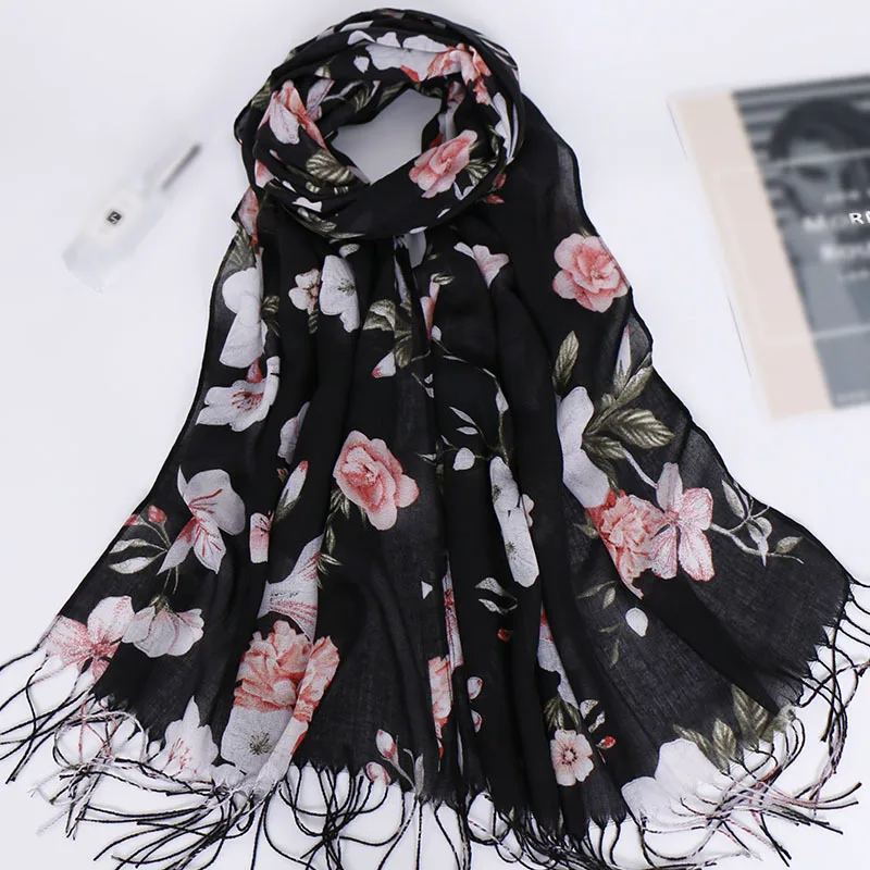 Женский шарф с принтом в виде цветов, Модный хлопковый шарф с принтом в виде цветов, шарф для головы, Пашмина с длинными кисточками, хиджаб, 2019