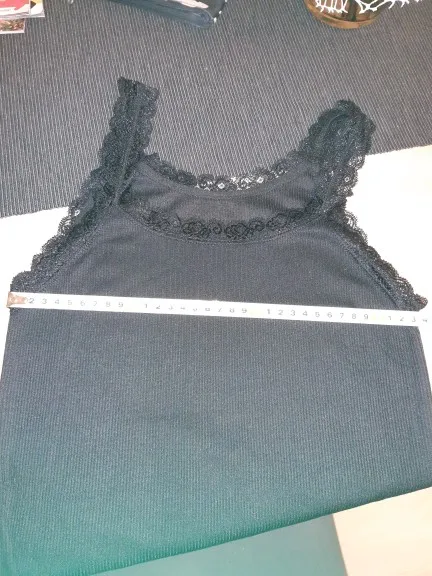 Топ очень милый и хорошего качества. Хлопок плотный, не мнется, не тянется. Хорошая отделка, пряжа не торчит. Черный цвет-черный (zdjecia przekloamujj). Размер не является универсальным, Подходит для европейских XS-S, в большинстве размеров меньше. При обхвате под грудью 97 см находится стык.