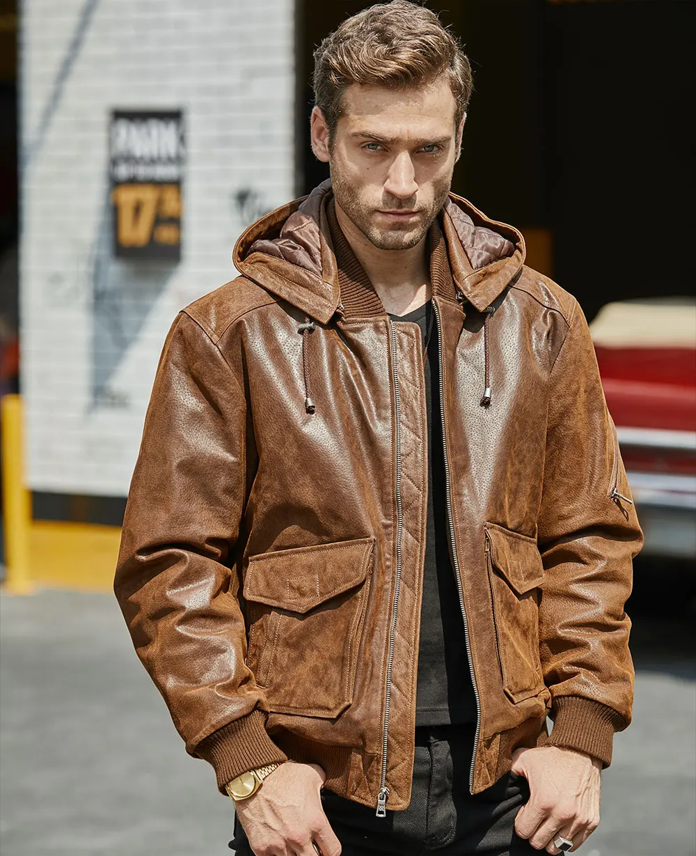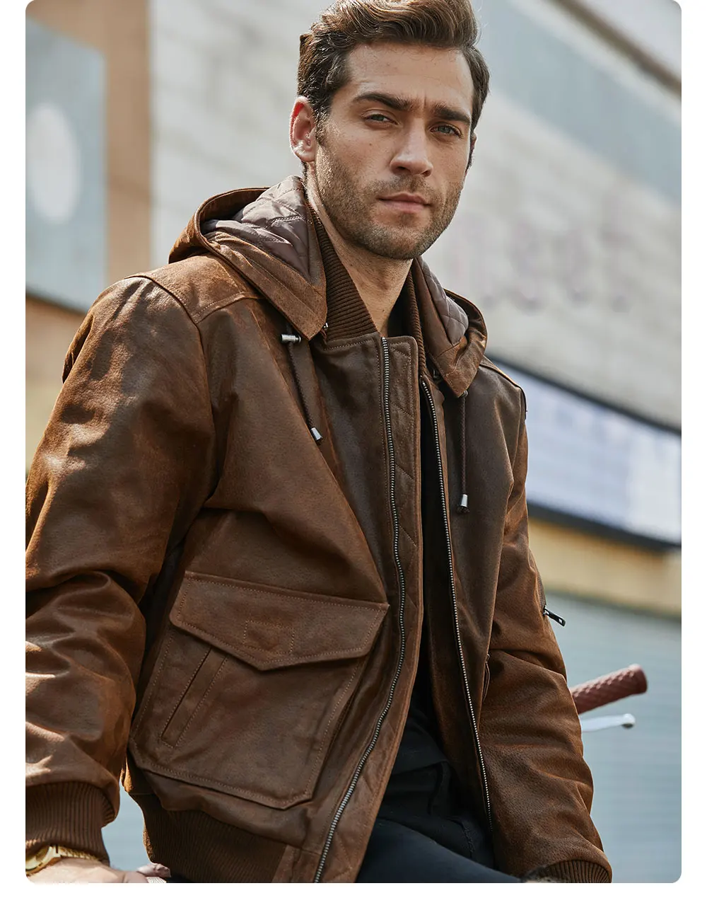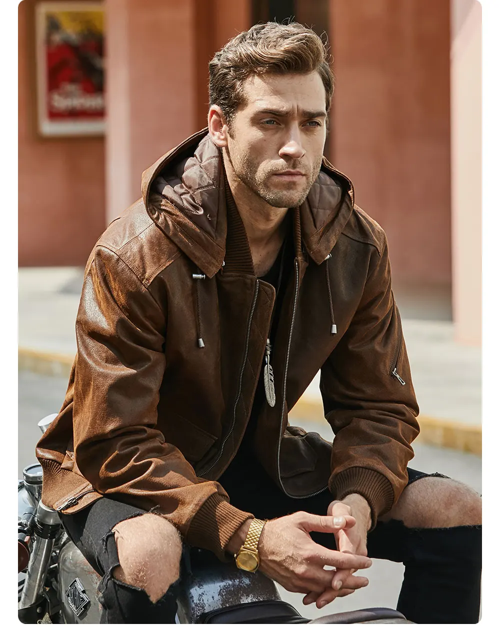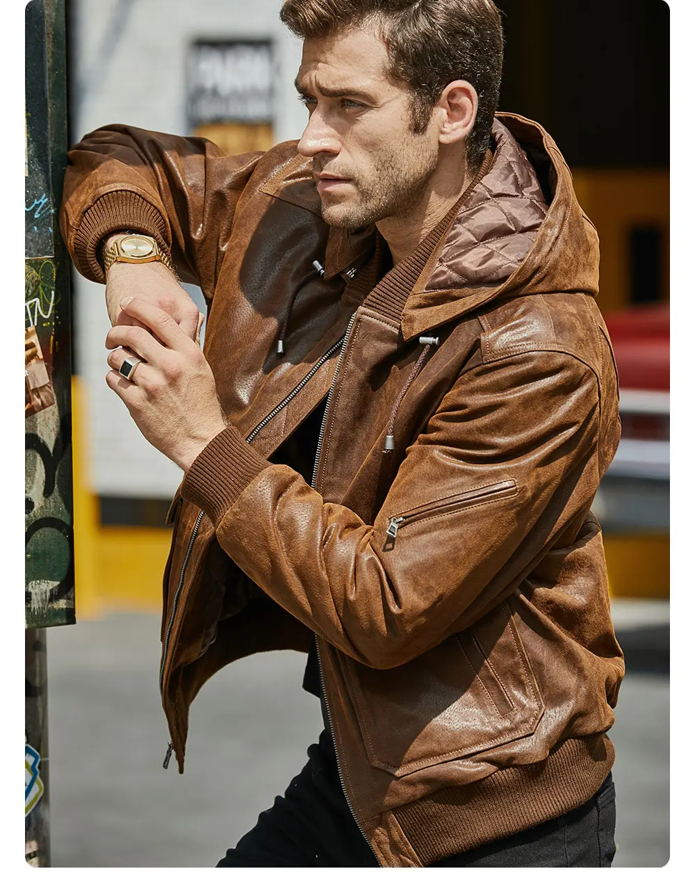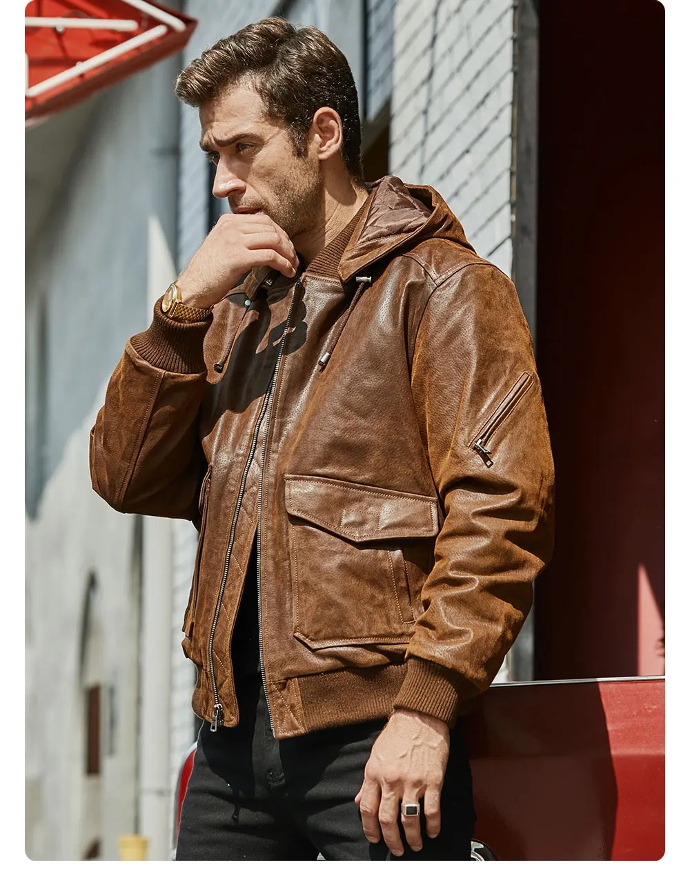Новая мужская кожаная куртка, коричневая куртка из натуральной кожи со съемным капюшоном, теплая кожаная куртка для мужчин