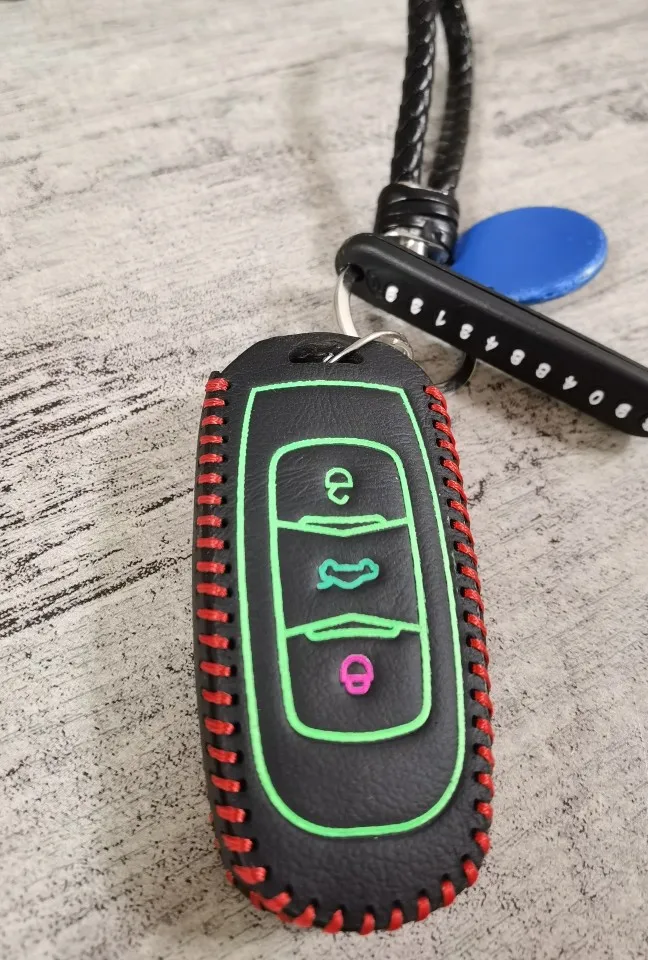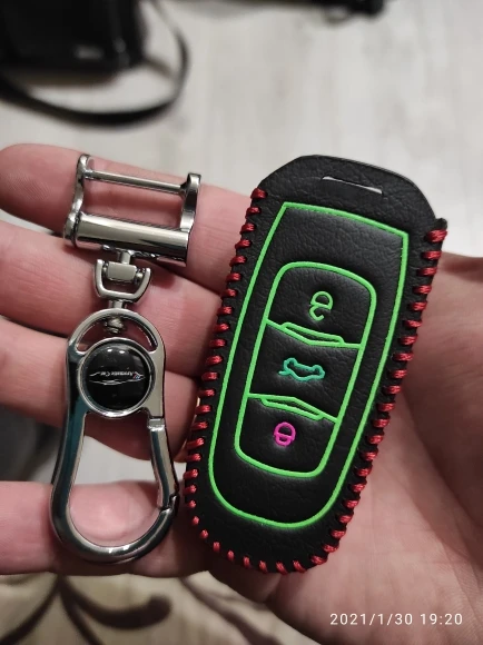 Получил быстро. Ключ зашел в чехол очень плотно. Немного не хватает глубины. Совпадение прорези на чехле и ключе не точное. Светится. Вроде кожа.